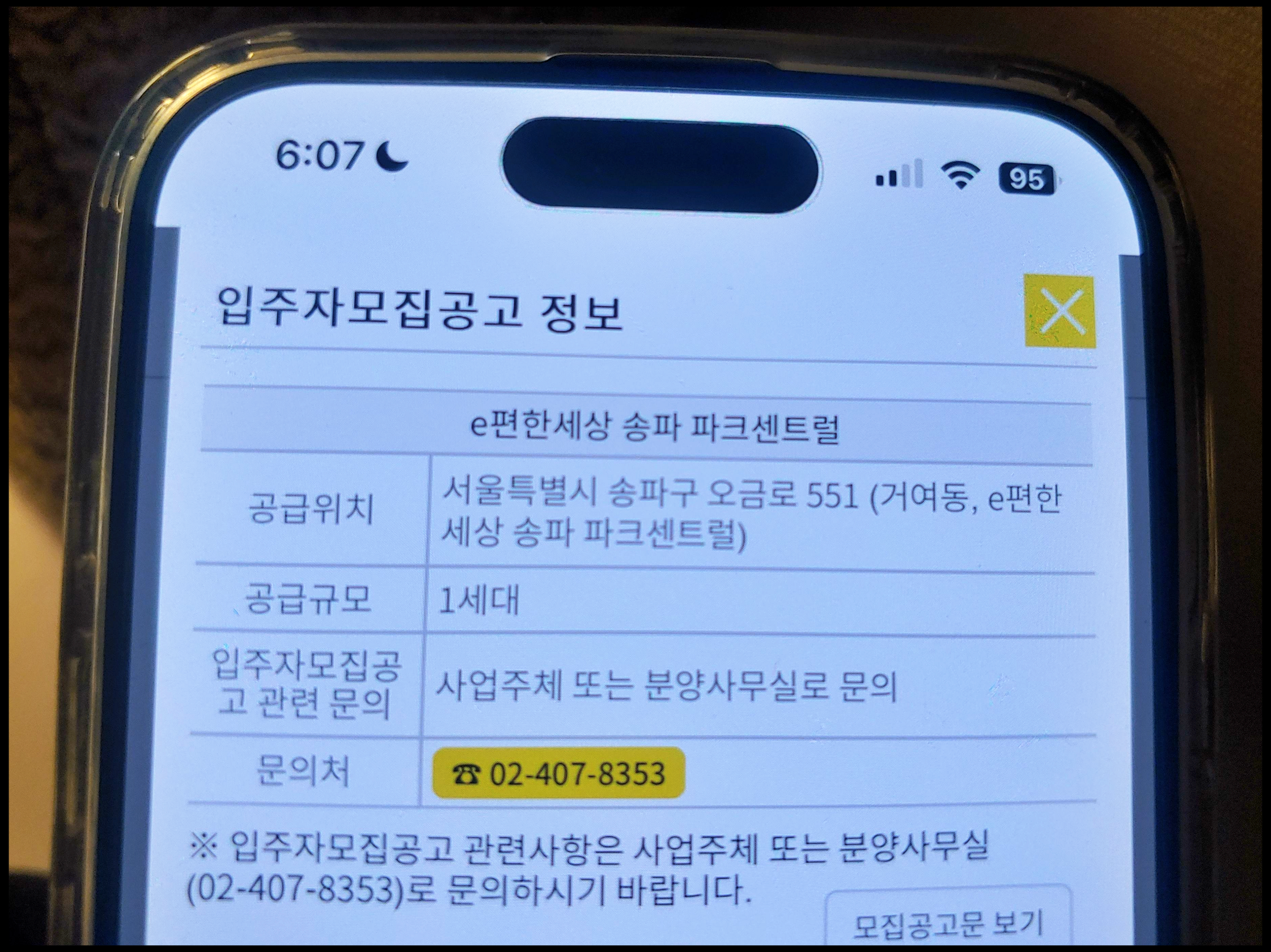 [사진 = e편한세상 송파파크센트럴 줍줍 청약 일정 이렇습니다. 특별공급 다자녀가구 접수일 1월 14일 화요일, 당첨자 발표일 1월 17일 금요일, 서류접수일 1월 20일 월요일, 계약체결일 1월 20일 월요일 ~ 1월 24일 금요일입니다. 설 연휴 이전에 계약 과정을 마칠 수 있는 일정입니다. 입주는 오는 2월 예정입니다. 84타입 다자녀가구 1세대 모집에 속합니다. (C) 청약홈 앱]