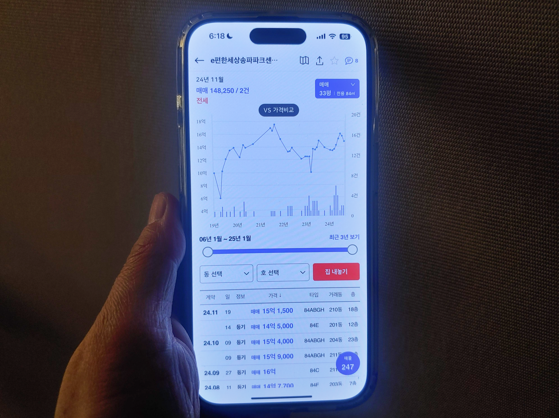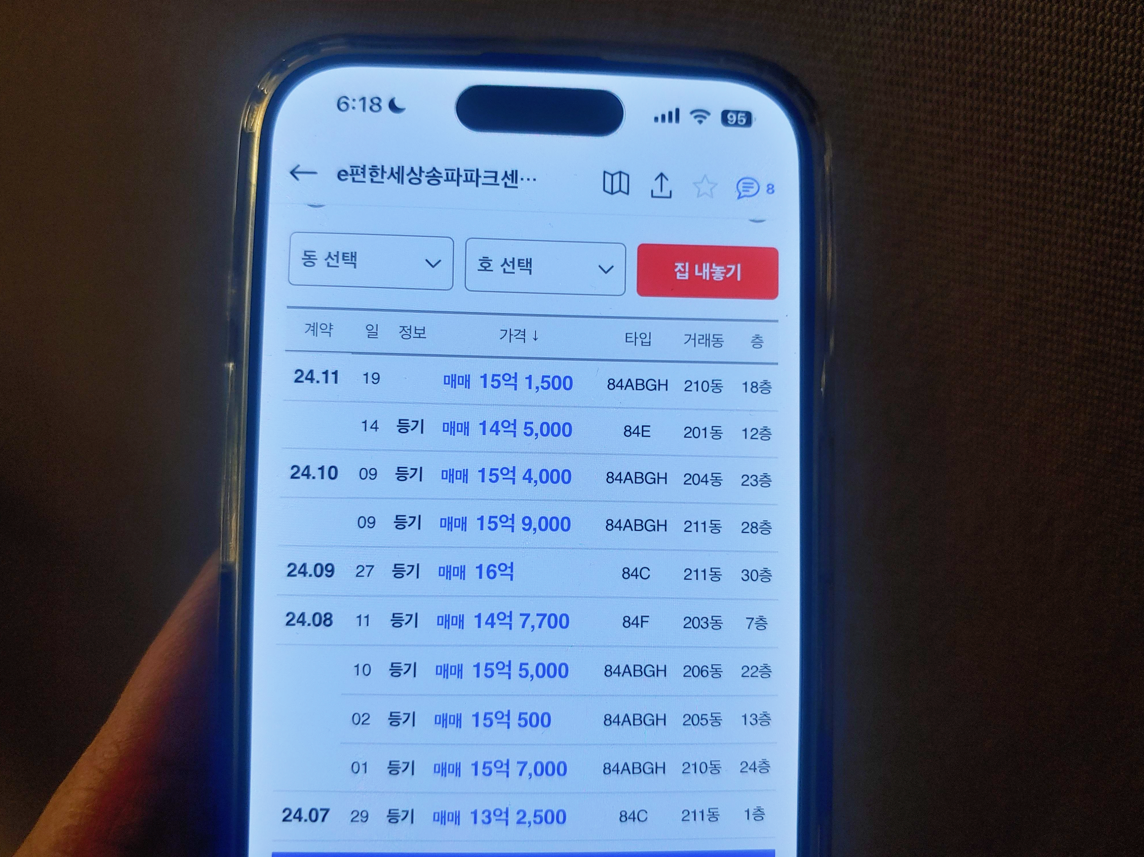[사진 = e편한세상 송파파크센트럴 84타입 최근 거래 내역입니다. 지난해 11월 14억 5,000만 원 및 15억 1,500만 원 거래가 있습니다. 206동 중에서는 최근 거래가 15억 5,000만 원입니다.(2024년 8월) 아울러 이곳 아파트 네이버 부동산에 올라온 84타입 매물들의 최소 가격은 14억 5,000만 원부터 시작합니다. 이번에 줍줍으로 나온 매물의 공급금액 9.8억 원으로서, 만약 당첨되신 분은 어마어마한 시세 차익 효과 누릴 수 있습니다. 그야말로 5억 로또 입니다. (C) 아실 앱, 네이버 부동산]