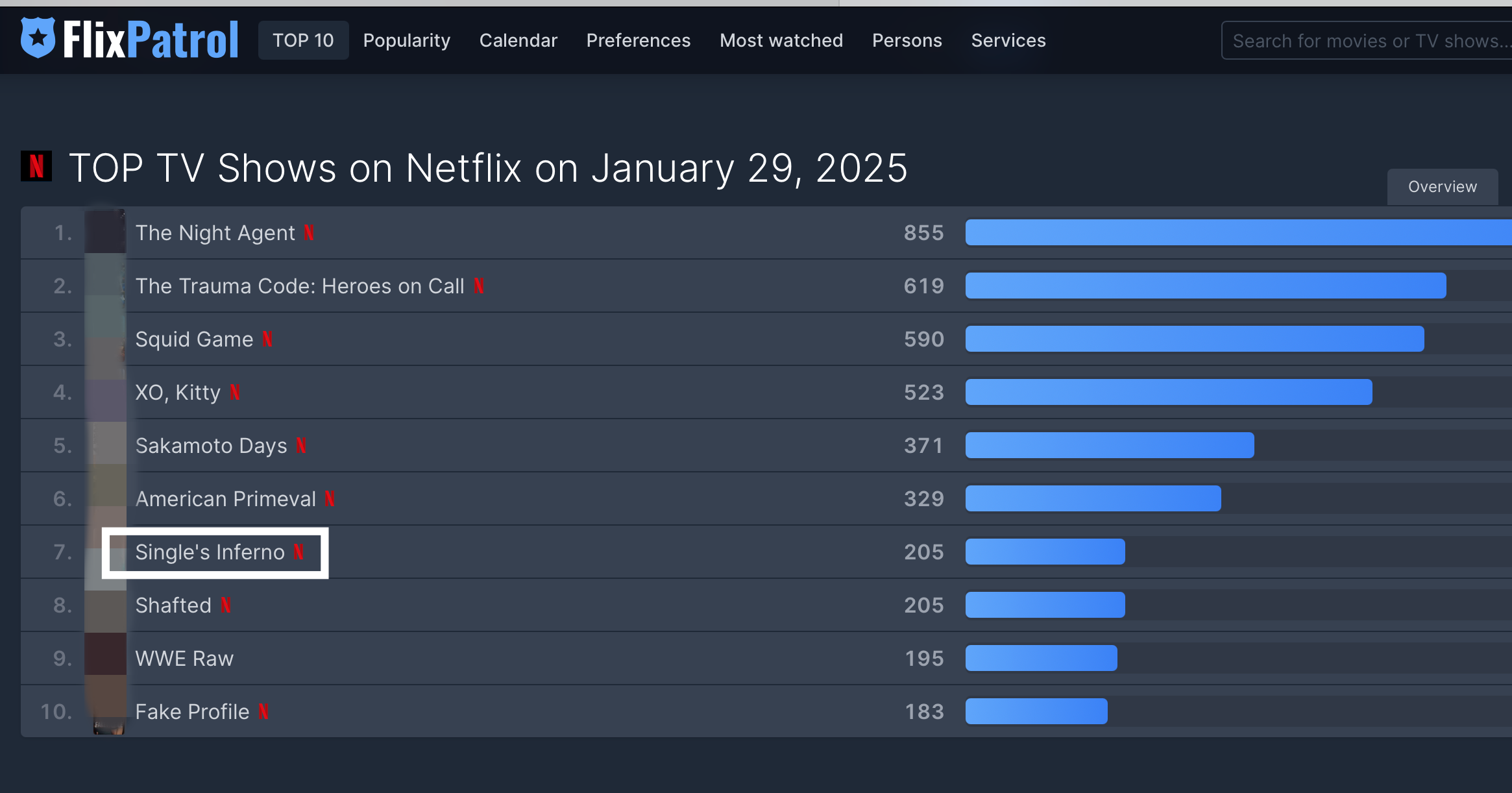 [사진 = 솔로지옥4 넷플릭스 시청 순위 집계 사이트 플릭스패트롤(FlixPatrol)에서 TV시리즈 부문 전 세계 7위 기록중입니다.(1월 29일 기준) 솔로지옥4 프로그램 영어명 Single's Inferno 입니다. 그 밖에 한국 드라마로는 2위 중증외상센터, 3위 오징어게임 포함됐습니다. 이렇게 한국 프로그램이 전 세계 TOP10에 3개 포함중입니다. 솔로지옥4가 해외에서 흥행중임을 알 수 있습니다. (C) 플릭스패트롤 홈페이지(Flixpatrol.com)]