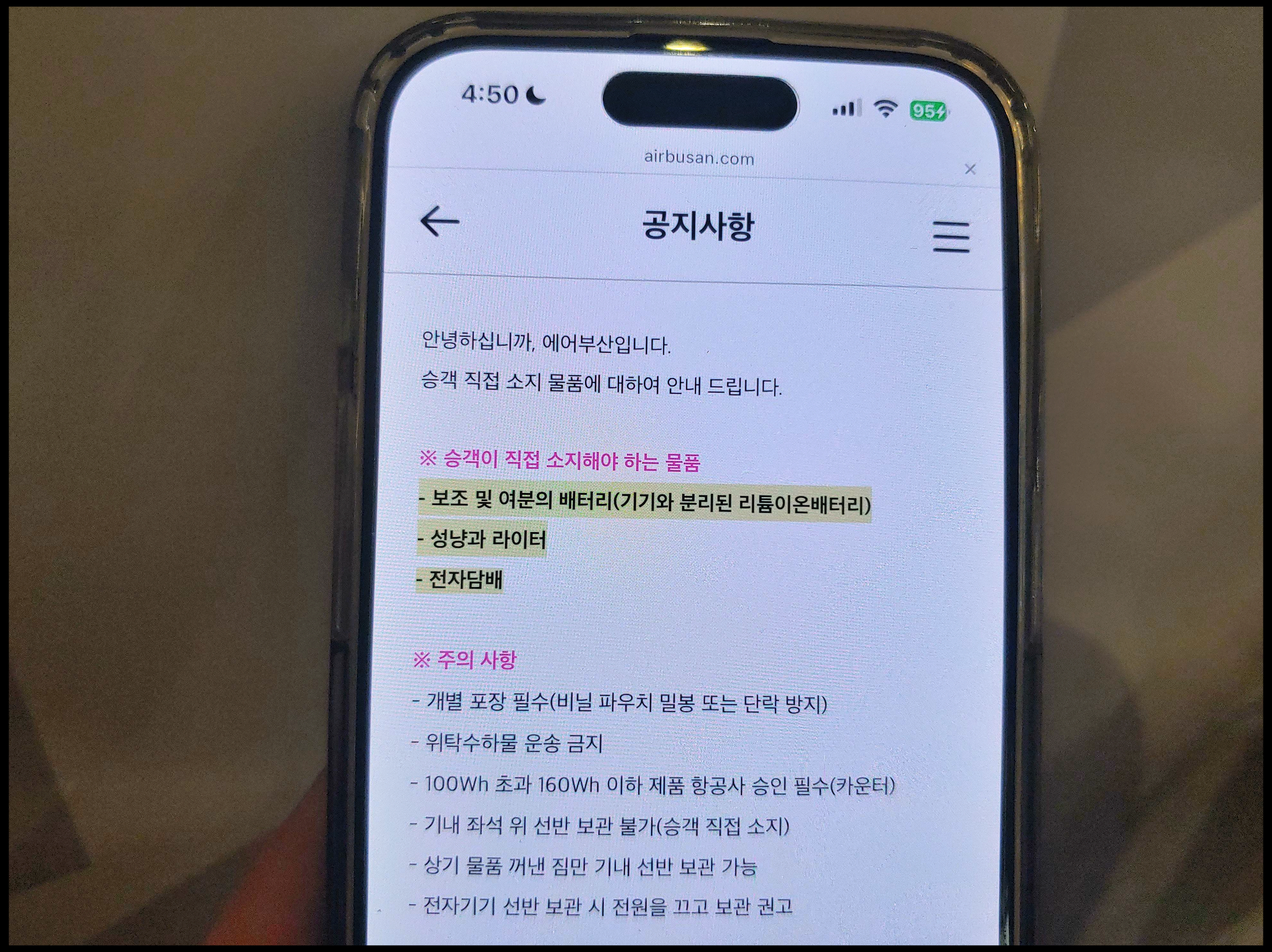 -기내 탑승시, 보조배터리를 선반에 보관하면 안됨. 좌석 앞주머니에 두는 등 자신이 직접 관리 가능한 곳에 두어야 함