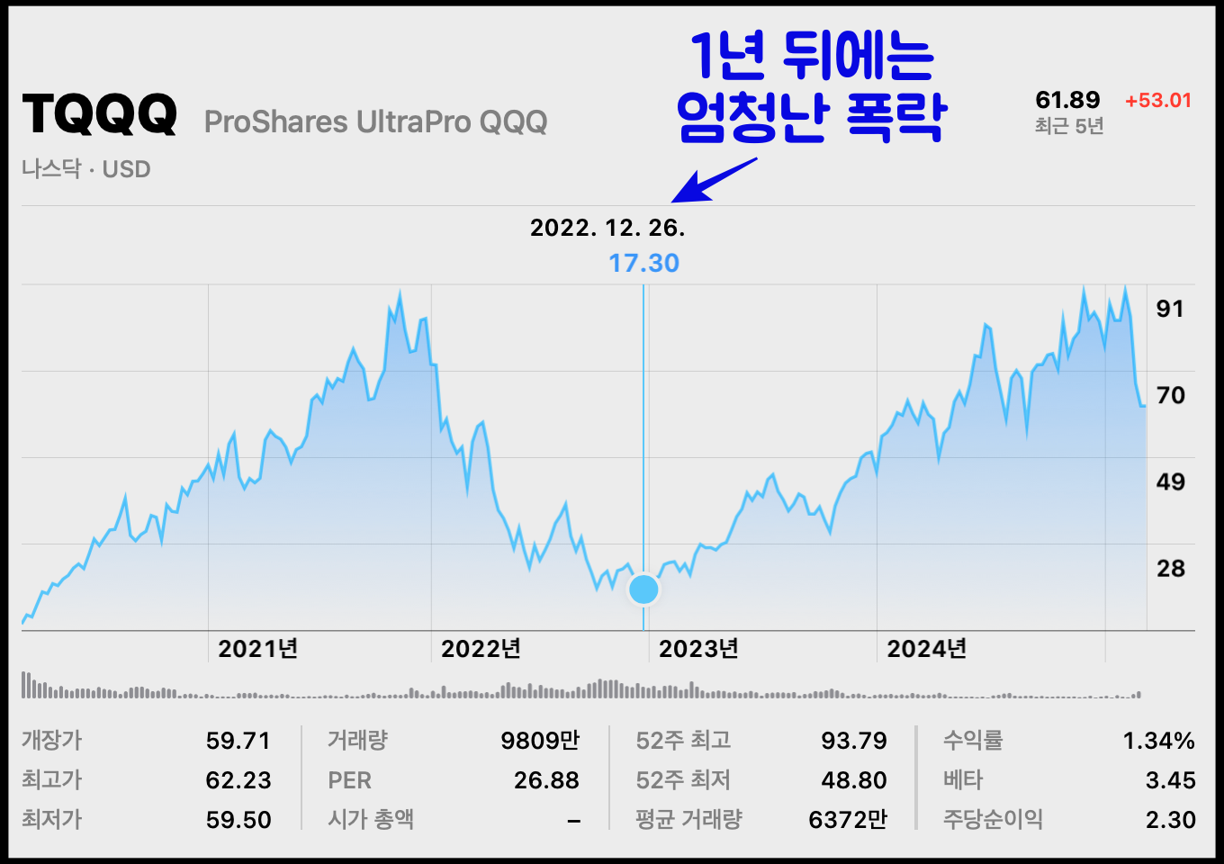 [사진 = TQQQ 주가 과거의 기록을 살펴봤습니다. 이 포스팅에서 언급된 2022년 3월 16일 8.88달러, 2021년 11월 15일 88.57달러, 2022년 12월 26일 17.30달러 확인할 수 있습니다. 2025년 3월 14일 현재는 61.89달러입니다. 변동폭이 얼마나 높은지 알 수 있습니다. 이 종목이 빅테크 비중 높다보니 강세장일 때 오름세가 탄력을 받습니다. 하지만 하락장일 때의 내림세가 어마어마합니다. TQQQ 장기투자 목적으로 들어가기에는 안정적이지 않습니다. 단기 트레이딩에 어울리는 종목 같습니다. (C) 맥북 주식 앱]