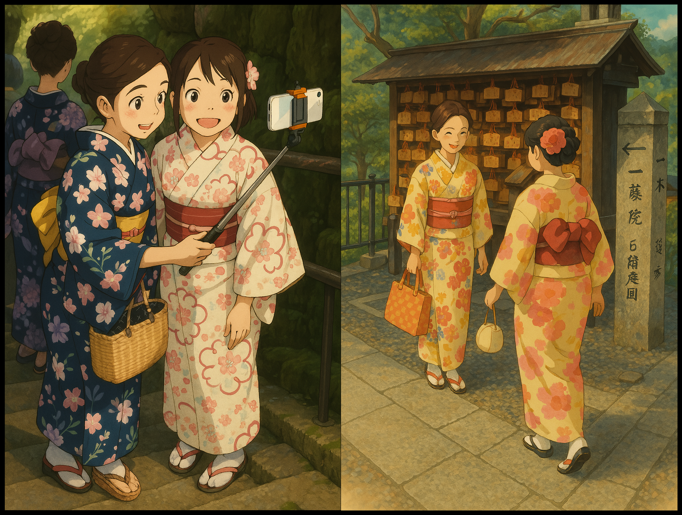 이번에는 또 다른 일본여행 사진을 올렸습니다. 사진 촬영을 했던 저의 시선에서는, 현실에서 봤던 모습에 비해서 생성된 이미지가 일본의 전통스러운 감성을 진하게 담아낸 것 같습니다.