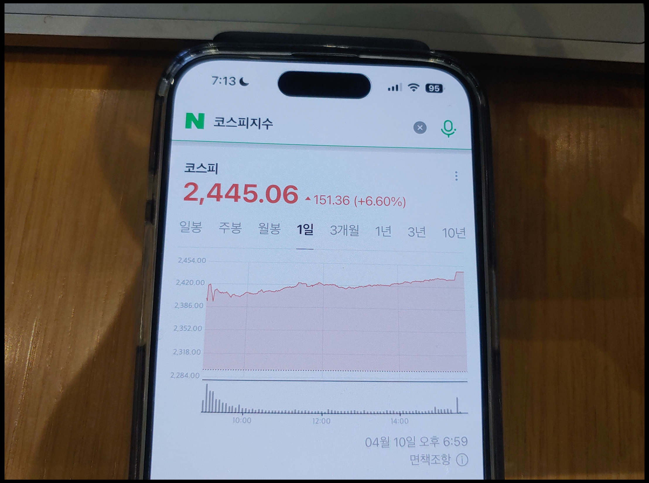 [사진 = 4월 10일 코스피 지수 2,445.06 기록하며 전날에 비해 6.60% 올랐습니다. 전날에는 2,200선 후반까지 내려갔는데 다시 2,400선 되찾았습니다. 해당 지수가 하루에 6% 오른 적은 지난 3개월 기준으로 봤을 때 흔치 않습니다. 트럼프 관세 정책이 한국의 경제를 좌우할 수 있음을 알 수 있습니다. 한국은 수출이 중요한 나라이기 때문입니다. (C) 네이버 앱]