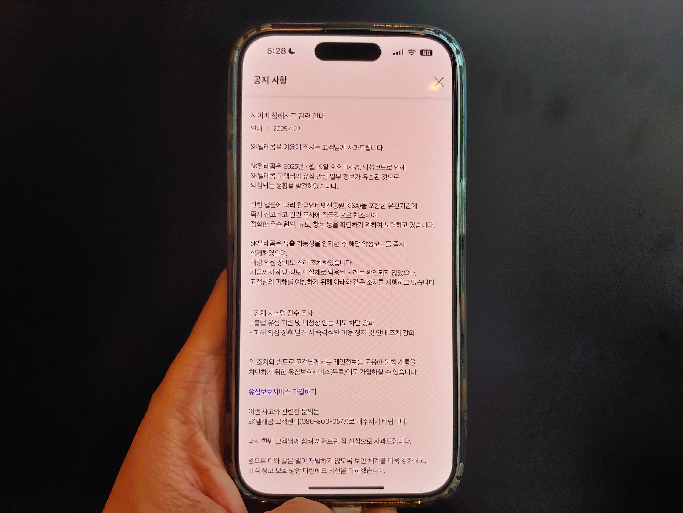 자신의 스마트폰 이동통신사가 SKT(SK텔레콤)라면 이 부분 꼭 참고하시면 좋습니다. 해당 이동통신사가 얼마 전 해커로부터 악성코드 공격을 받았습니다. 고객 정보 해킹에 의해 해당 이동통신사 일부 정보가 유출된 것으로 추정된다고 합니다. 문제는 이것이 단순한 개인정보 유출이 아니라는 점입니다. 유심 정보를 노린 해킹 공격이기 때문입니다. 유심은 사람을 인증하는 목적이 있습니다. 그 기기의 사용자가 누구인지 식별하고 인증하는 역할을 하며, 개인정보가 저장됐습니다. 만약 그 해커가 이것을 악용하면 휴대폰 번호 도용, 본인 인증을 통한 금융사기 등이 발생할 우려가 있습니다.