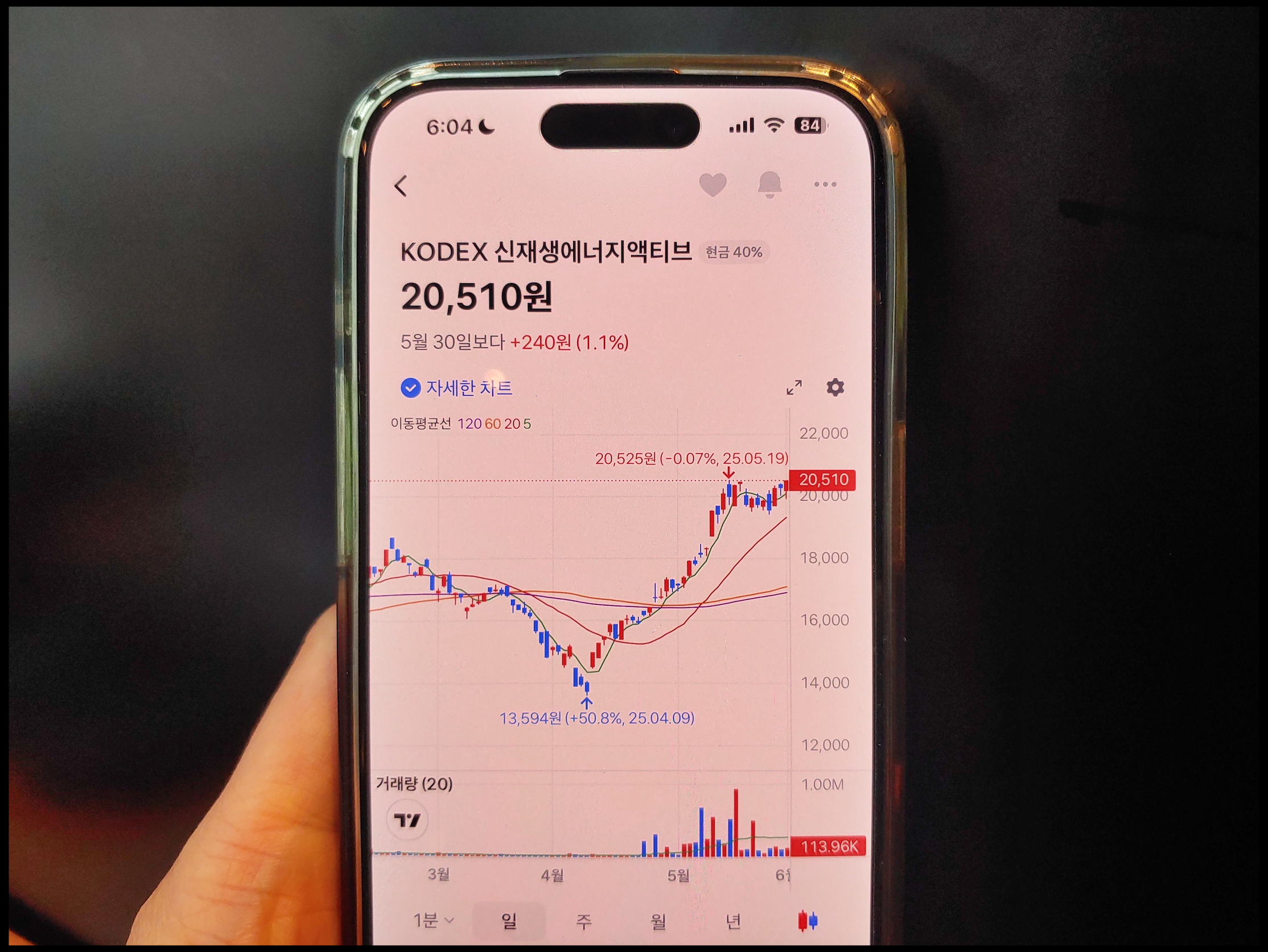[사진 = 재생에너지 ETF 관심 두는 분들도 계실 것 같습니다. 그중에 하나가 KODEX 신재생에너지액티브 입니다. 지난 4월 9일 13,594원이었다가 5월 19일 20,525원까지 치솟았습니다. 6월 2일 현재는 20,510원 기록중입니다. 보유 비중 상위 종목 중에 두산에너빌리티(8.8%) 비중이 가장 높습니다. 그 다음으로 HD현대일렉트릭(7.6%) LS ELECTRIC(7.2%) SK오션플랜트(7.1%) 씨에스윈드(6.3%) 등이 있습니다. (C) 토스 앱]