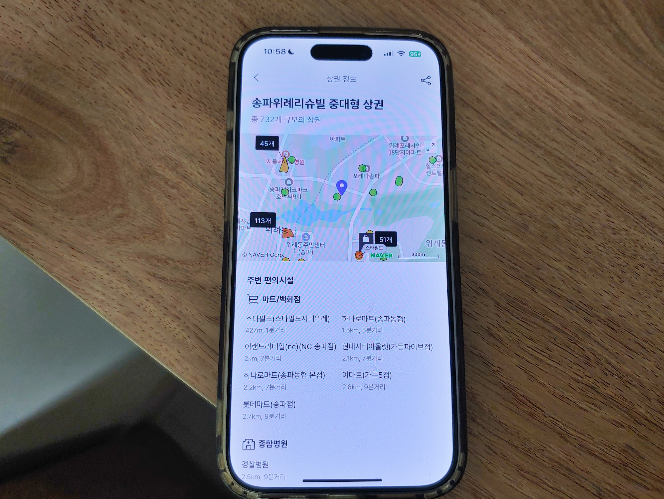 [사진 = 이곳의 상권은 호갱노노에서 중대형으로 분류됐습니다. 아마도 자가용 기준이 될 텐데, 1분 거리에 스타필드시티 위례 매장이 있어서 이곳 이용하는 분이 많을 것 같습니다. 자가용 기준 10분 이내 거리에 도달할 수 있는 대형마트가 여럿 됩니다. 반경 1km 이내 음식점 334개이며, 학원 74개인 점도 눈에 띕니다. (C) 호갱노노 앱]