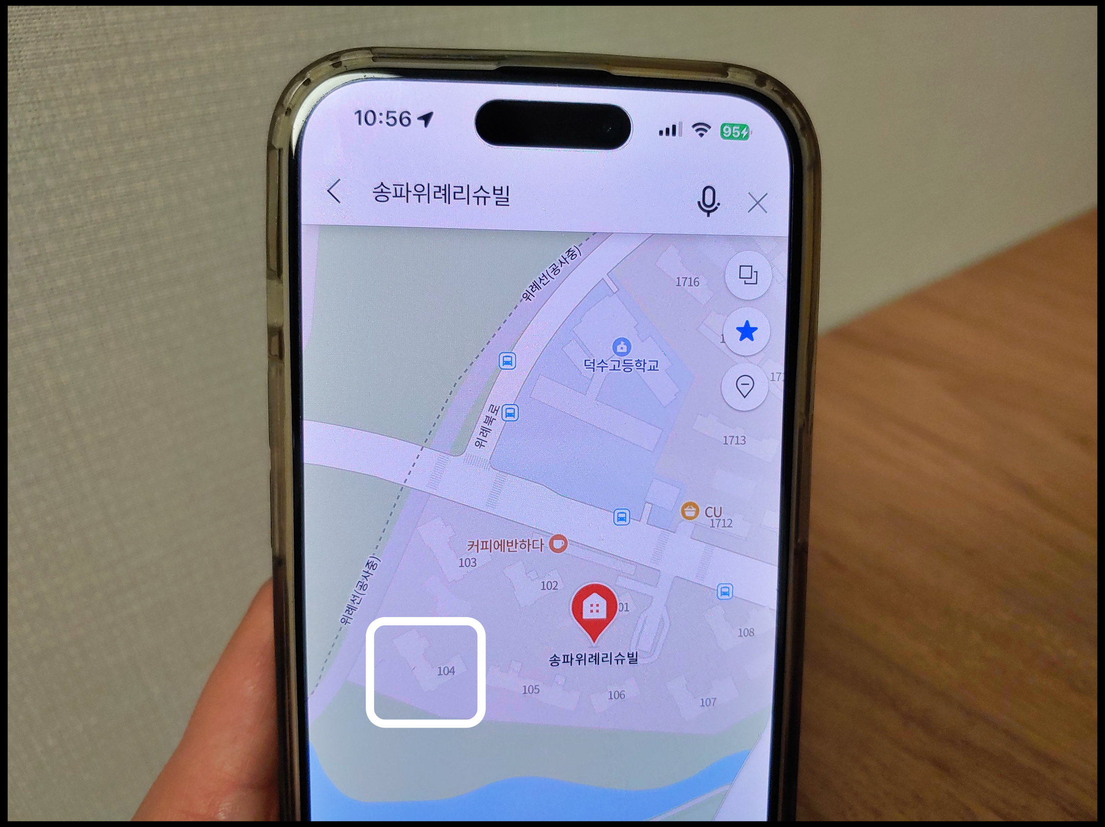 [사진 = 해당 아파트 단지의 104동은 지도상에서 봤을 때 호수 View 기대할 수 있을 것 같습니다. 남향 기준으로 앞에 건축물이 없습니다. (C) 네이버 지도 앱]