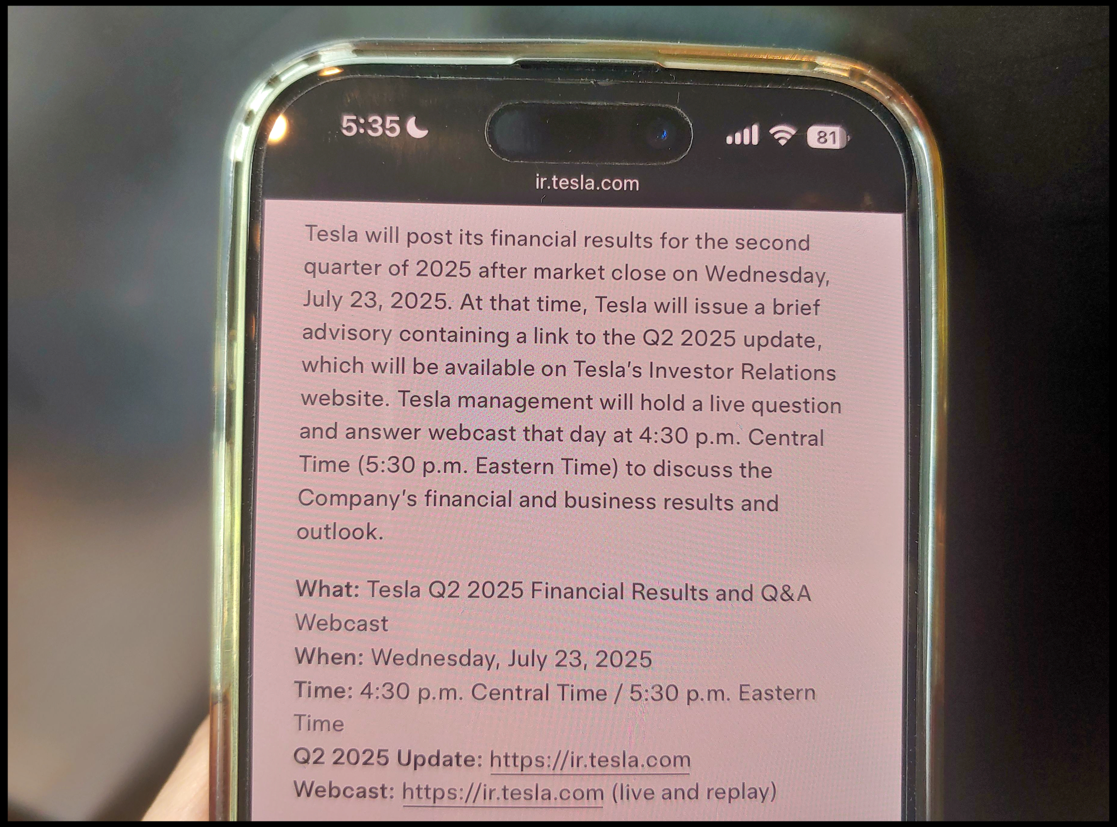 [사진 = 테슬라 보도자료에 따르면, 테슬라 2025년 2분기 실적발표일 미국 동부 시간 기준 7월 23일 수요일 오후 5시 30분입니다. 미국 중부 표준시 기준으로는 오후 4시 30분이며, 한국 시간 기준 다음날 오전 6시 30분입니다. 과연 실적이 어떻게 될지 앞으로 며칠 뒤에 공개됩니다. (C) 테슬라 IR 홈페이지(ir.tesla.com)]