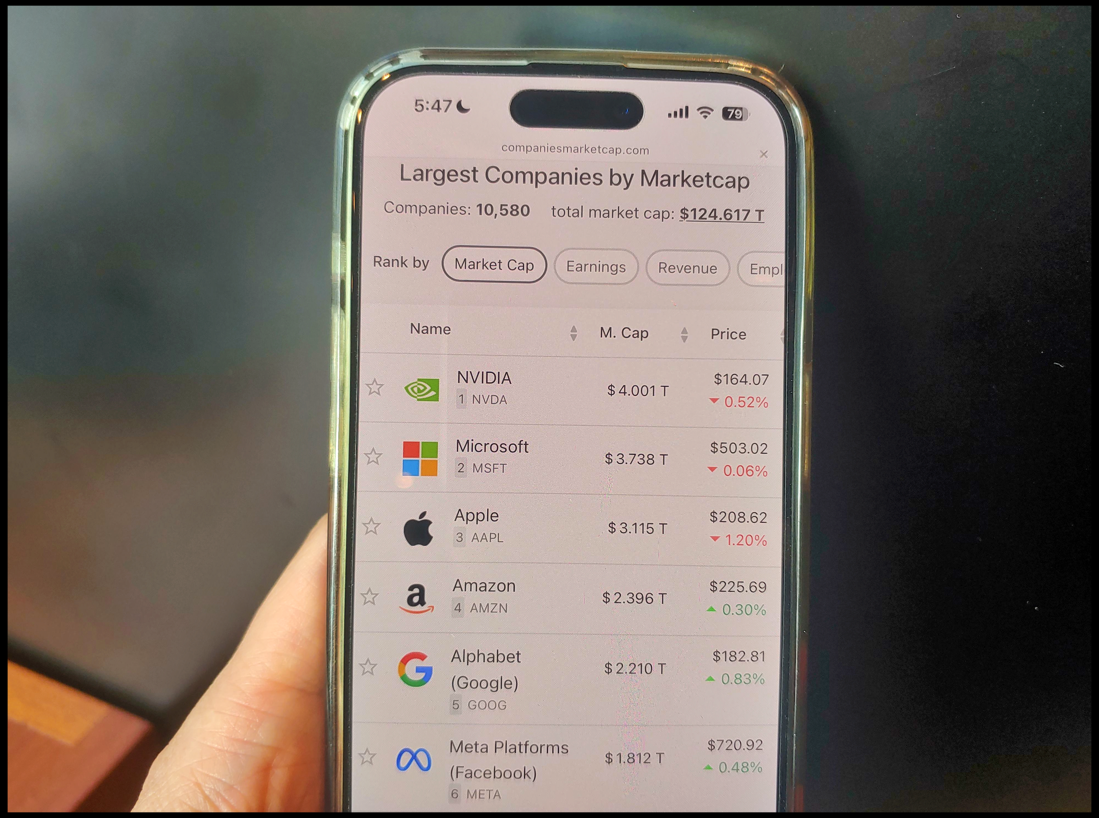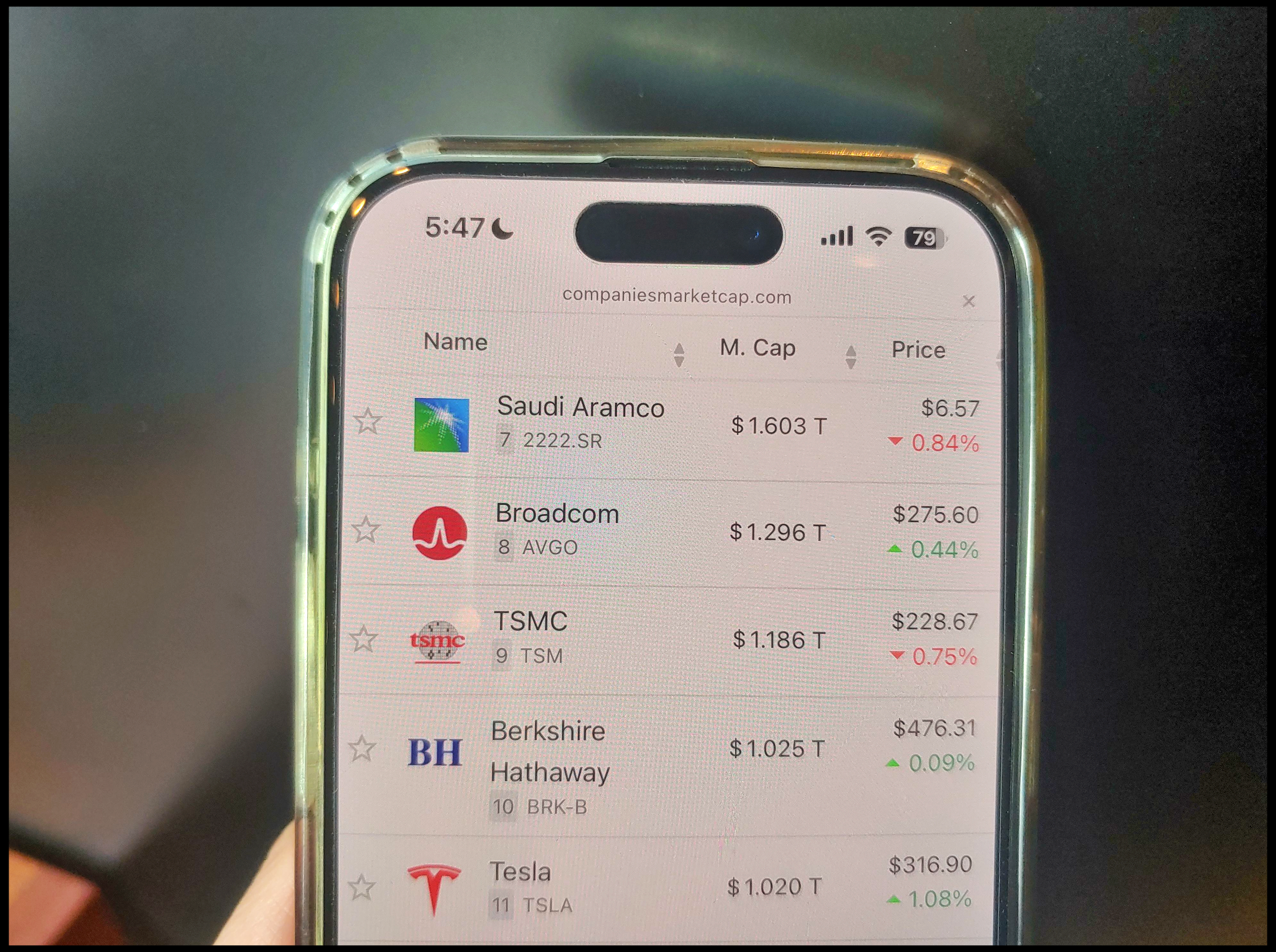 [사진 = 7월 15일 현재 기준 전 세계 상장기업 시가총액 순위. 엔비디아 1위, 마이크로소프트 2위, 애플 3위, 아마존 4위, 알파벳(구글) 5위, 메타 6위입니다. 7위는 사우디 기업 아람코이며, 8위 브로드컴, 9위 TSMC(미국증시 상장된 대만 기업), 10위 버크셔 해서웨이(BRK-B) 입니다. 그 뒤를 이어 11위 테슬라입니다. 흔히 테슬라는 미국 빅테크 TOP7으로 꼽힙니다. 하지만 최근 주가 부진으로 브로드컴보다 시가총액이 더 낮습니다. 만약 지금의 주가 추이가 좋지 않으면 브로드컴에게 빅테크 TOP7 넘겨줘야 할지 모릅니다. 빅테크 TOP7 기세를 되찾으려면 주가 상승 탄력 받아야 합니다. 이번 2분기 실적발표가 중요한 이유입니다. (C) 컴퍼니즈마켓캡 홈페이지(companiesmarketcap.com)]