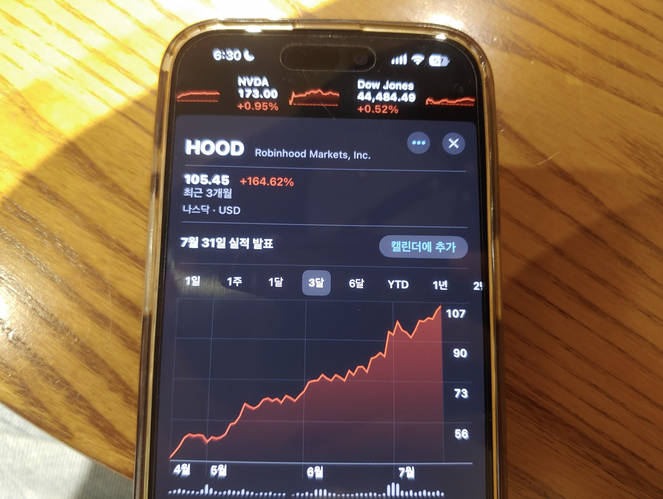 [사진 = 로빈후드 주가 오름세 또한 눈길을 끕니다. 최근에 100달러 넘었습니다. 불과 3개월 전에는 40달러대였는데 이제 2배 이상 올랐습니다. (C) 아이폰 주식 앱]