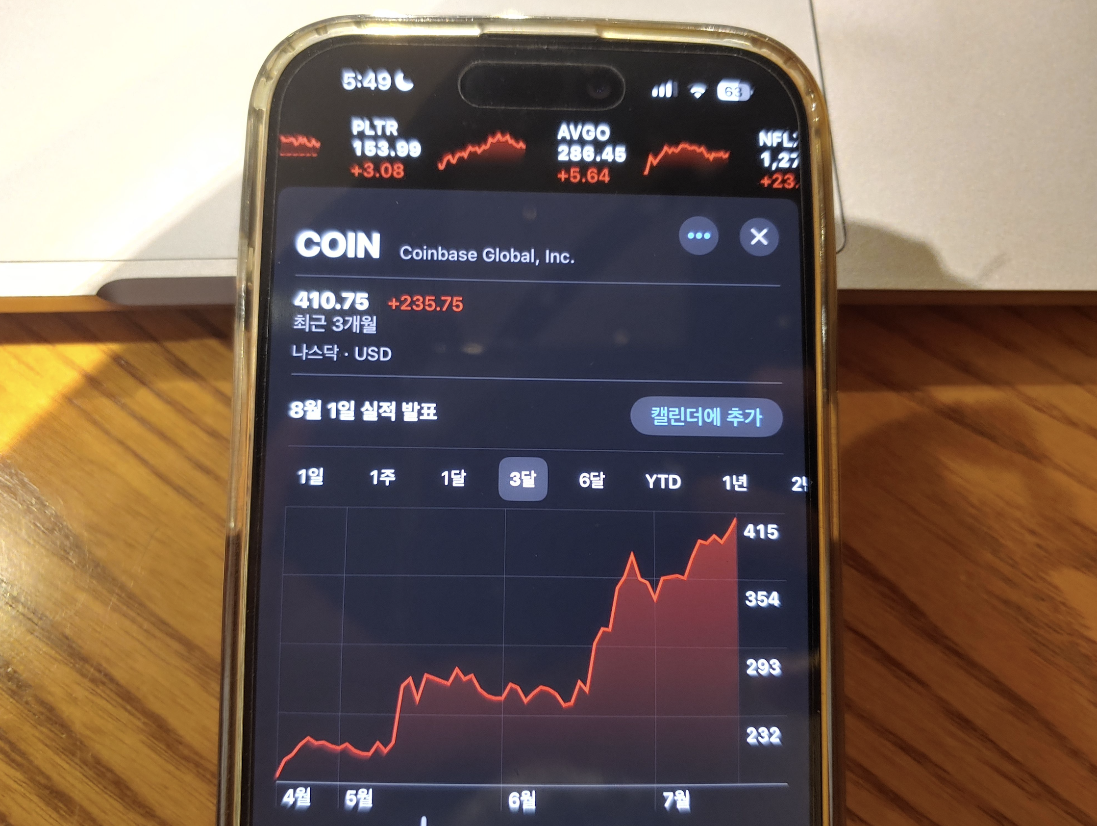 [사진 = 지니어스법안 코인베이스 글로벌 수혜주 종목입니다. 이 종목은 미국 최대의 가상화폐 거래소입니다. 스테이블코인 거래량 늘어날 가능성이 예상되면서 주가 오름세 탄력 받았습니다. 7월 17일에 처음으로 400달러 넘었습니다.(410.75달러, 전날보다 12.55달러 증가) 7월 18일 현재 프리장에서는 418.74달러 기록중입니다. 불과 2개월 전이었던 5월 초 무렵에는 232달러 전후에 있었는데 이제는 거의 2배 올랐습니다. (C) 아이폰 주식 앱]