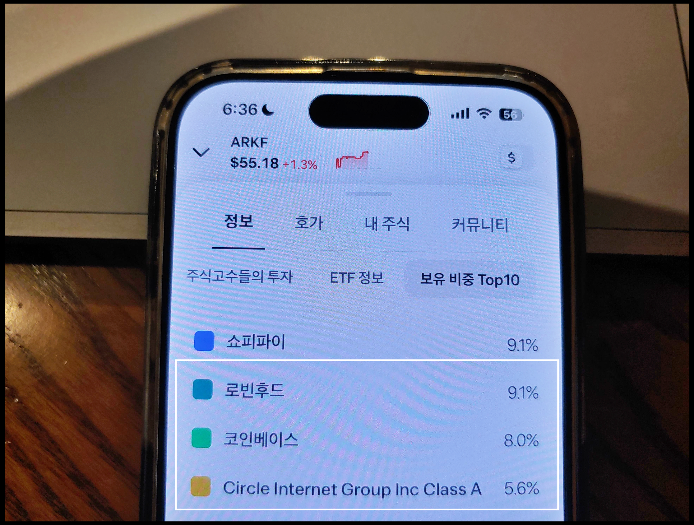 [사진 = 코인베이스 글로벌, 로빈후드, 써클 인터넷 그룹 함께 포함된 ETF들이 있습니다. 캐시 우드의 투자회사 아크 인베스트먼트에서 운영하는 ARKF(아크 핀테크 이노베이션 ETF, 핀테크 기업 투자) ARKK(아크 이노베이션 액티브 ETF, 혁신기업 투자) 보유 종목 중에서 비중이 높은 편입니다. 두 ETF 모두 꾸준한 오름세 나타냈습니다. 참고로 ARKK는 테슬라 비중이 가장 높습니다. 두 ETF에 팔란티어 비중이 어느 정도 포함된 점도 눈길을 끕니다. (C) 토스 앱]