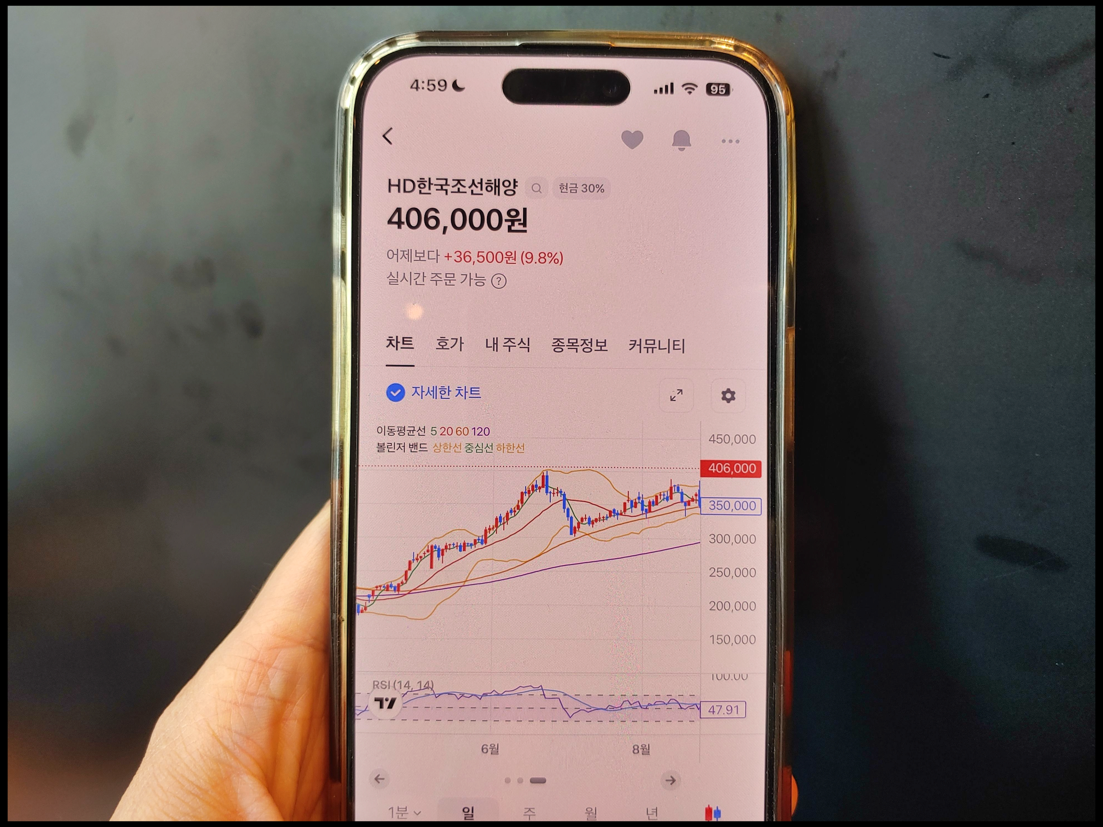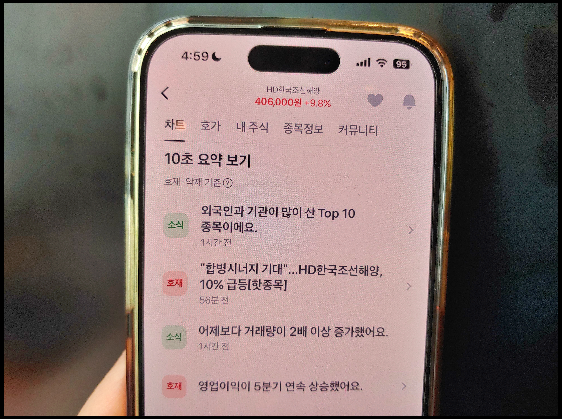 마스가 관련주 종목 중에 하나는 HD한국조선해양 입니다. 8월 28일 오후 4시 58분 기준, 전날보다 9.8% 오른 406,000원 기록했습니다. 지난 10년 기준 가장 높은 고점입니다. 이날 상승 이유는 HD현대의 조선 계열사 HD현대중공업 및 HD현대미포 합병 때문이며, 두 회사의 최대 주주이기도 합니다. 마스가 프로젝트 앞두고 회사의 역량을 키우기 위한 목적이 있는 것으로 알려졌습니다. 이번 합병이 국내 주식 시장에서 긍정적 영향이 있었습니다. / 사진 (C) 토스 앱]