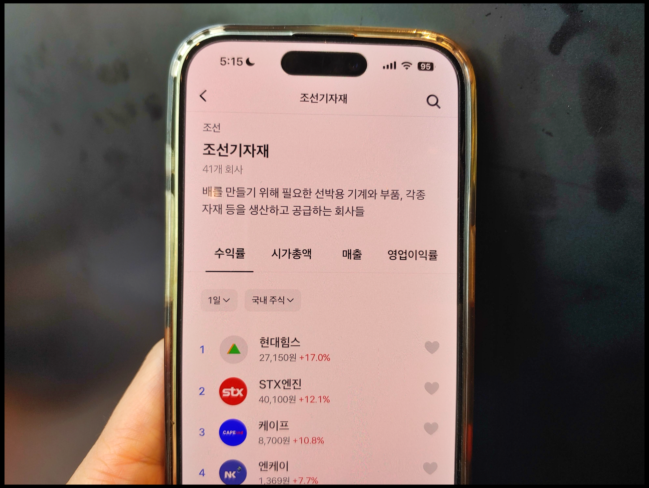 [사진 = 8월 28일 조선 기자재 기업들의 오름세 눈에 띕니다. 현대힘스, STX엔진, 케이프, 엔케이 전날보다 뚜렷하게 올랐습니다. (C) 토스 앱]