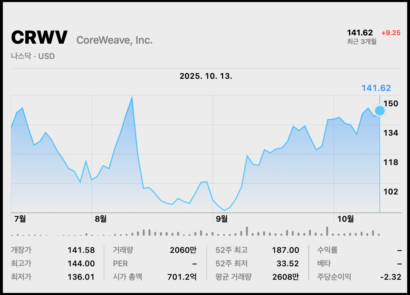 [사진 = 코어위브 주가 지난 3개월 동안의 추이를 보면 변동이 컸습니다. 8월 중순에 갑자기 한 순간에 크게 빠졌으나 9월에 다시 회복했습니다. 9월 4일 87.48달러였는데 10월 13일 141.62달러로 마쳤습니다. 거의 2배 올랐습니다. 이 종목도 최근 미중관계 영향을 받을 가능성이 잠재적으로 있습니다. 최근에 너무 올랐으니 말입니다. 그럼에도 AI 산업이 계속 성장할 것이라는 기대감이 있어서, 이 종목을 아이렌과 함께 관심을 두는 분들이 있을 것으로 보입니다. 두 종목 모두 엔비디아와 관련이 있습니다. (C) 맥북 주식 앱]