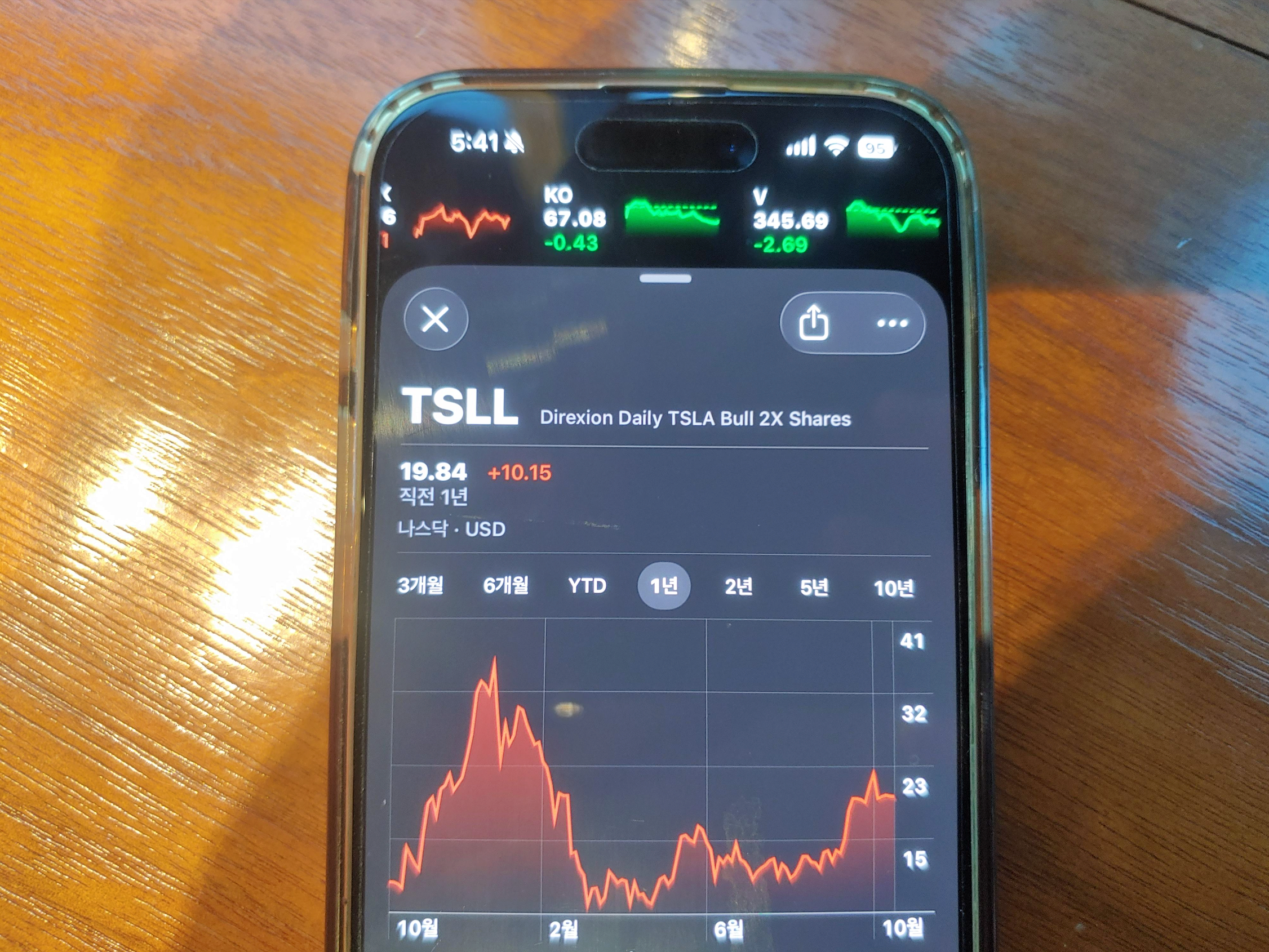 [사진 = 테슬라 2배 레버리지 TSLL 많은 분들의 꾸준한 주목을 끌고 있습니다. 10월 15일 종가 19.84달러 기록했습니다. 본주 기준으로 430달러대 기록중이지만, 지난해 12월 본주 기준 최고 488.54달러 및 TSLL 41.50달러 도달했습니다. TSLL이 그때에 비해 많이 녹았음을 알 수 있습니다. 이 종목이 2배 레버리지 특성상 본주 하락 시 2배 더 내려가는 것은 어쩔 수 없지만, 장기 투자하기 좋은 종목은 아닌 것으로 보입니다. (C) 아이폰 주식 앱]