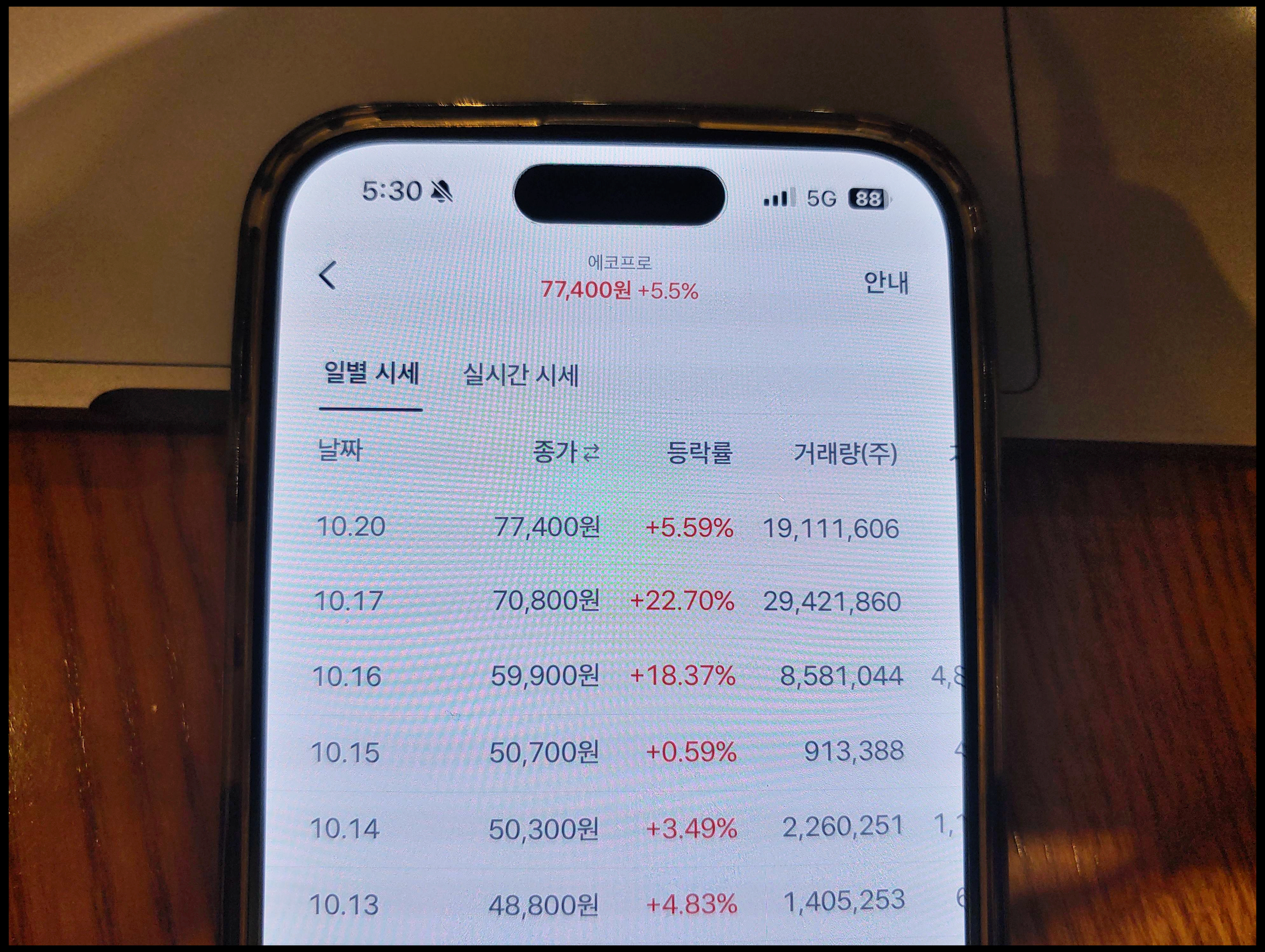 [사진 = 에코프로 주가 급등 눈에 띕니다. 10월 20일 토스에서 오후 3시 42분 무렵에 국내주식 인기 3위 기록했습니다. 전날보다 5~6% 정도 올랐습니다. 이 종목도 ESS와 관련 있습니다. 에코프로 그룹 계열사 에코프로비엠이 ESS용 양극재 생산기업이기 때문입니다. 해당 기업은 지난 10월 16일 18.37%, 17일 22.70% 크게 급등했던 적이 있습니다. 예전에 2차전지 인기 종목으로서 여론에 커다란 관심을 받았던 때를 재현하는 것 같습니다. 그때와 다른 점이 있다면 지금은 전기차 수요가 가라앉았으며, AI 산업의 성장으로 ESS가 뜨게 됐습니다. ESS 수요도 늘어나면 관련 부품을 다루는 2차전지 수요도 증가하게 됩니다. (C) 토스 앱]