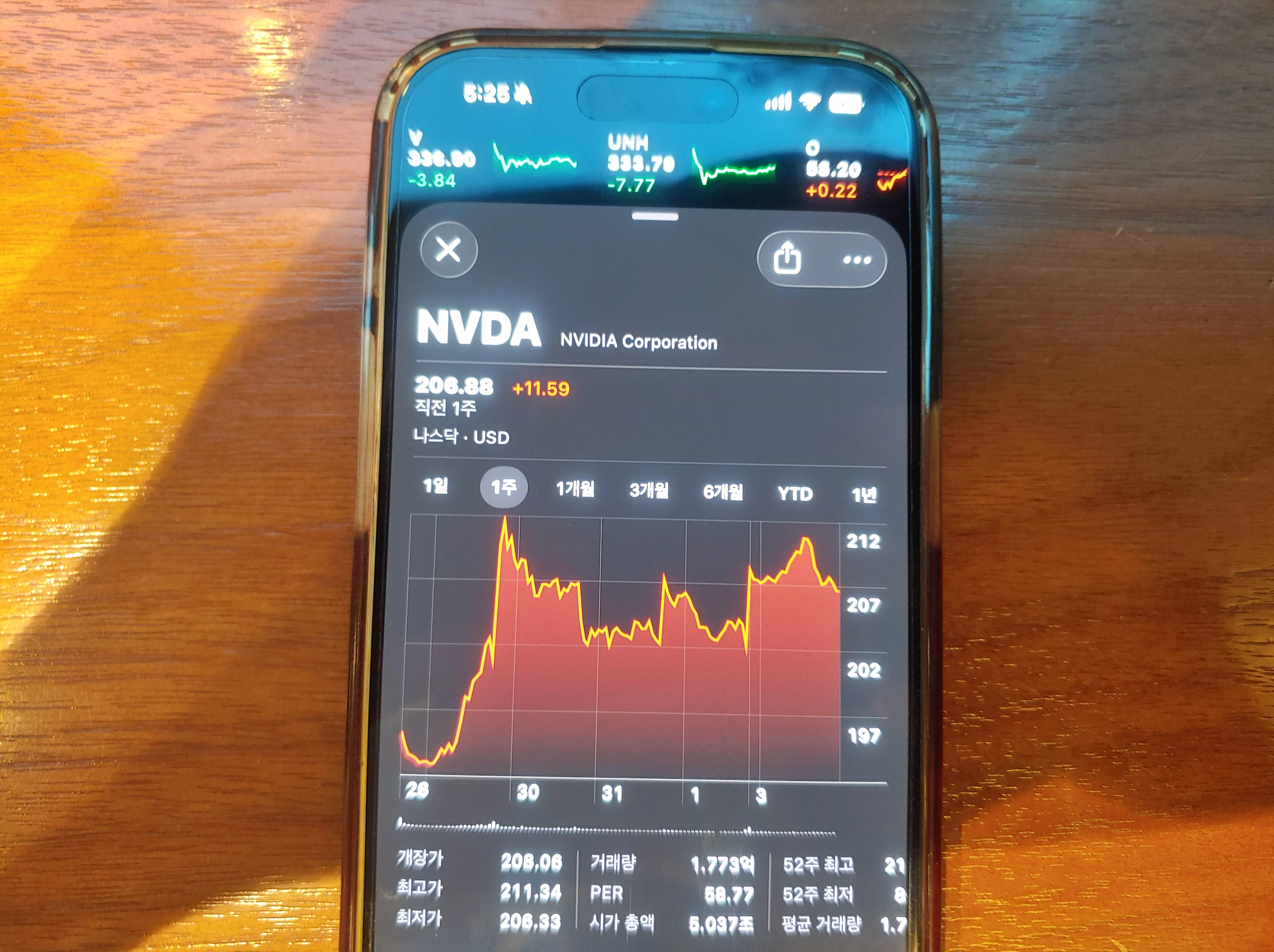 [사진 = 엔비디아 주가 최근 200달러대 진입했습니다. 한때는 210달러 넘기도 했습니다. 이제 200달러대 지지를 받으면 더 높은 곳으로 올라갈 가능성이 기대됩니다. (C) 아이폰 주식 앱]