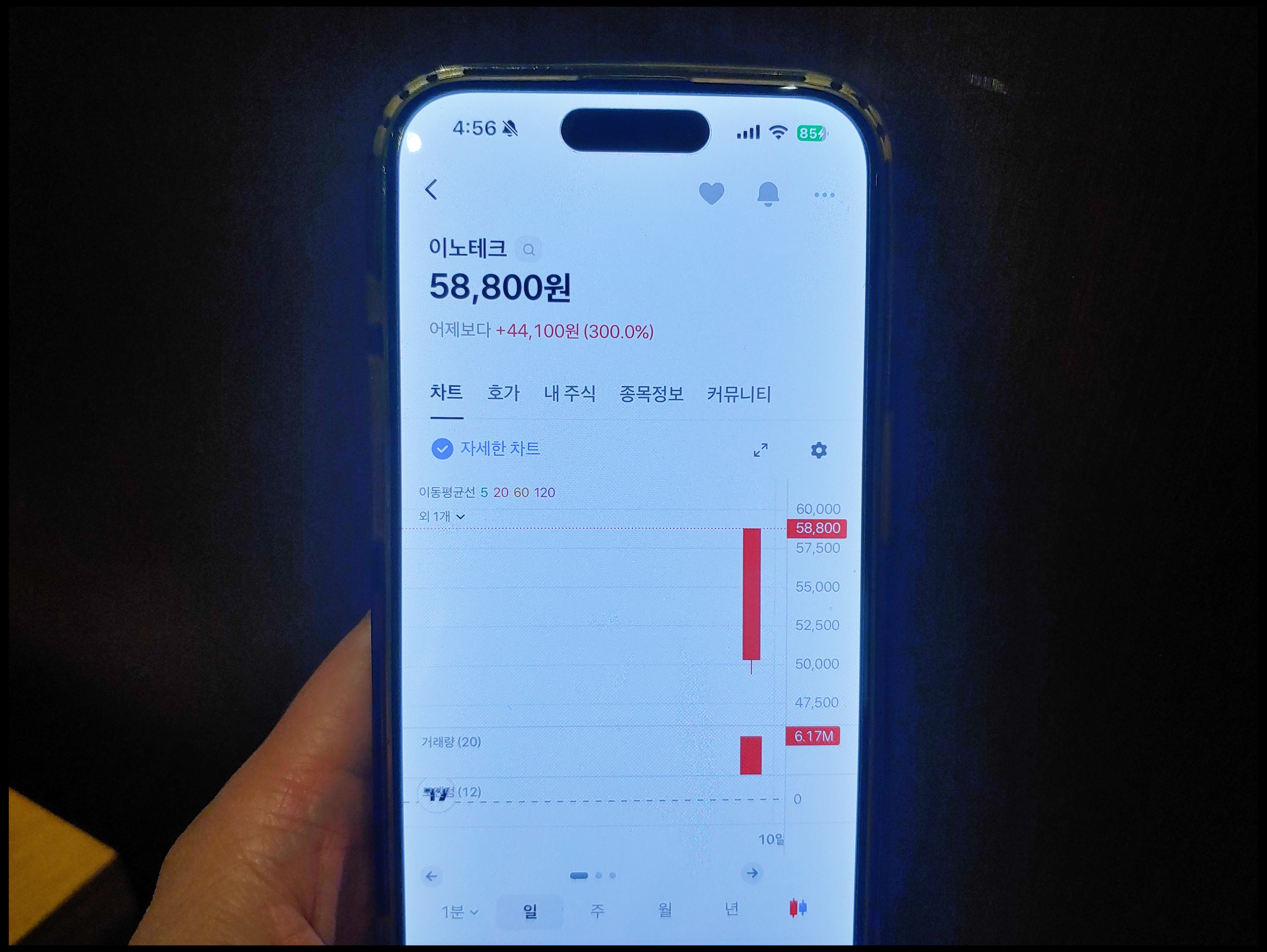 [사진 = 11월 3일 상장했던 이노테크 300% 오르며 종가 58,800원 기록했습니다. 오랜만에 300% 오르는 종목이 등장했습니다. (C) 토스 앱]