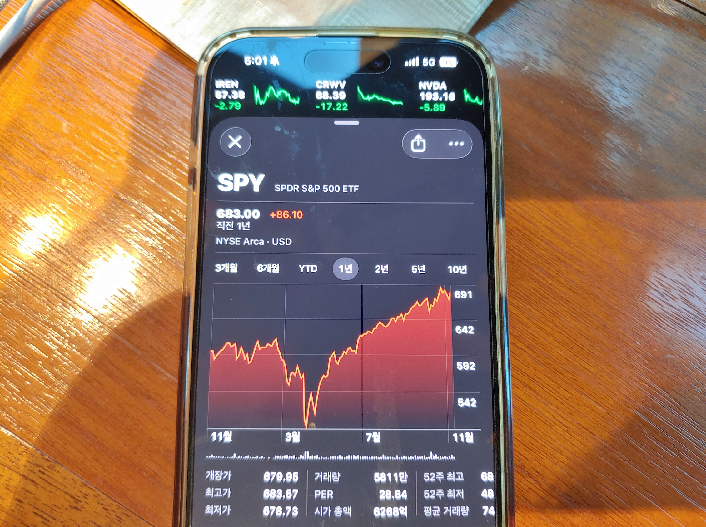 [사진 = 미국 ETF 대표적 종목은 S&P 500 추종 지수 SPY ETF 입니다. 흔히 미국주식 안전하게 모아갈 때 자주 거론되는 존재입니다. 지난 4월 관세 사태 이후로 7개월 지난 현재까지 상승 추세 유지중입니다. 중간에 조정이 살짝 살짝씩 있었으나 결국은 우상향 했습니다. 국내 주식 중에도 미국 S&P 500 추종하는 종목 들어가신 분이 많을 겁니다. ETF 장단점 중에서 개별 종목 일일이 파악하는 것에 비해 시간 절약이 되는 장점이 있으나 QQQ ETF(미국 나스닥 100 지수 추종)에 비하면 상승장에서 수익률이 떨어지는 아쉬움이 있습니다. 하지만 2022년 하락장에서는 QQQ보다 하락률이 더 낮았습니다. (C) 아이폰 주식 앱]