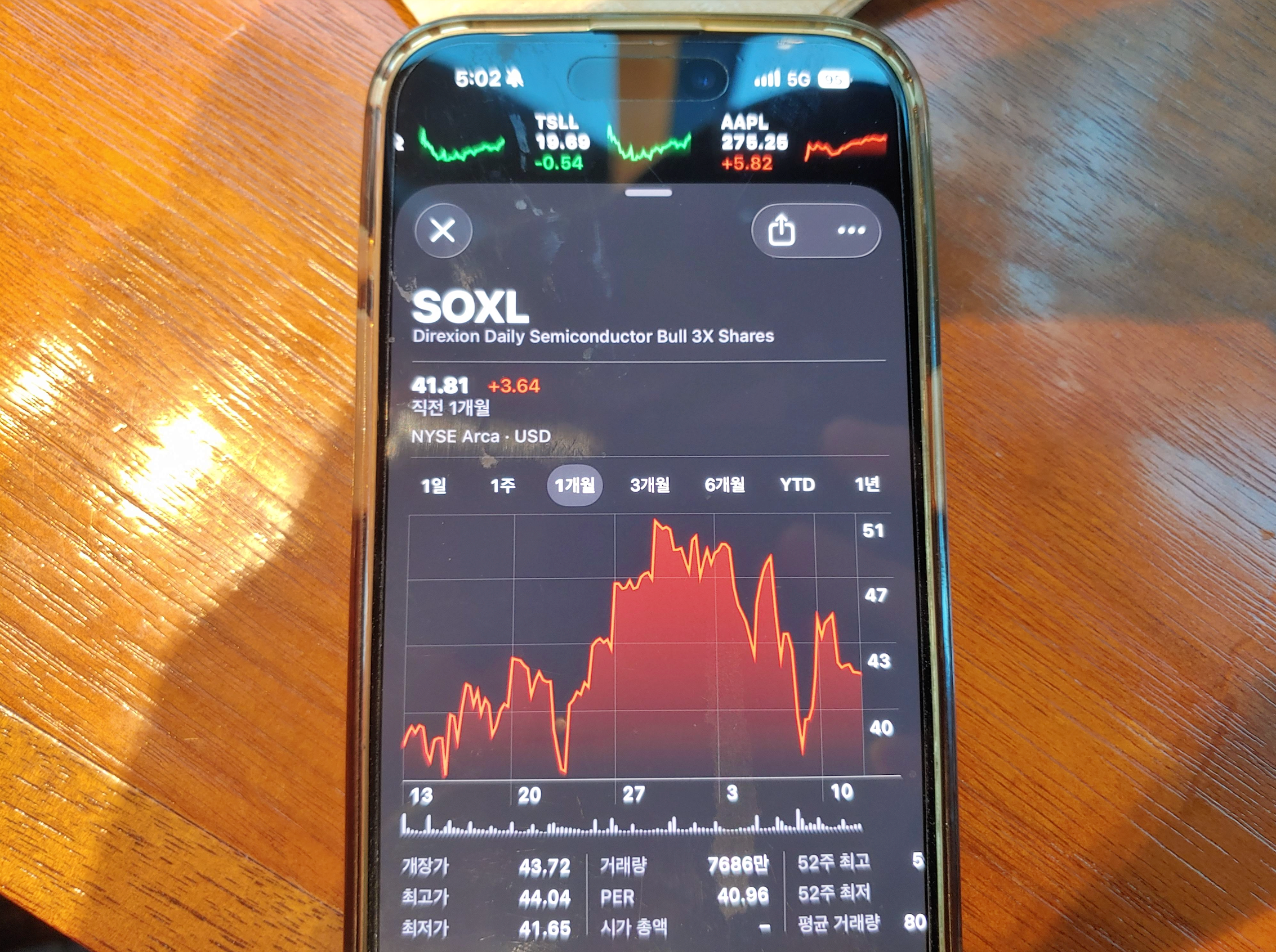 [사진 = 레버리지 ETF 중에 SOXL ETF 유명합니다. 미국 반도체 산업 지수에 투자하는 3배 레버리지 입니다. 지수가 오를 때 3배 오르고, 지수가 내려갈 때 하락률 3배 입니다. 안전한 종목이 아닙니다. 지난 몇 개월 동안 상승장이었기 때문에 재미를 봤던 분이 많았을 것으로 짐작합니다만, 지난 10월 말 50.76달러 고점 찍은 이후에는 변동이 심해졌습니다. 단기 고점이 점점 내려가는 형태입니다. 현재 종가는 41.81달러입니다. (C) 아이폰 주식 앱]