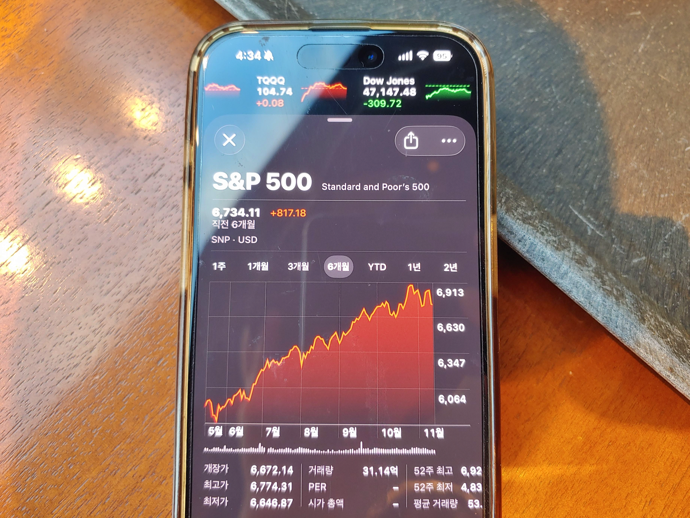[사진 = 미국 S&P500 지수 최근 6개월 동안의 흐름. 전반적으로 오름세였습니다. 4월 관세 사태 이후 10월까지 상승장 계속됐습니다. 중간에 잠시 조정 받았을 때가 있었으나 다음 상승을 위한 쉬어가기였습니다. 과열을 식히기 위해서 말입니다. 그러다가 10월 이후에는 조정의 폭이 이전 상승 구간에 비해 컸습니다. 나스닥 지수 하루에 3.56% 하락했던 날도 있었습니다. 그럼에도 10월 말에 크게 오르면서 10월 상승장 확정됐습니다. 11월 현재까지는 조정 혹은 하락이 짙습니다. 연말 상승을 위한 쉬어가기 여부는 아직 불확실합니다. 엔비디아 실적발표라는 변수가 있습니다. (C) 아이폰 주식 앱]