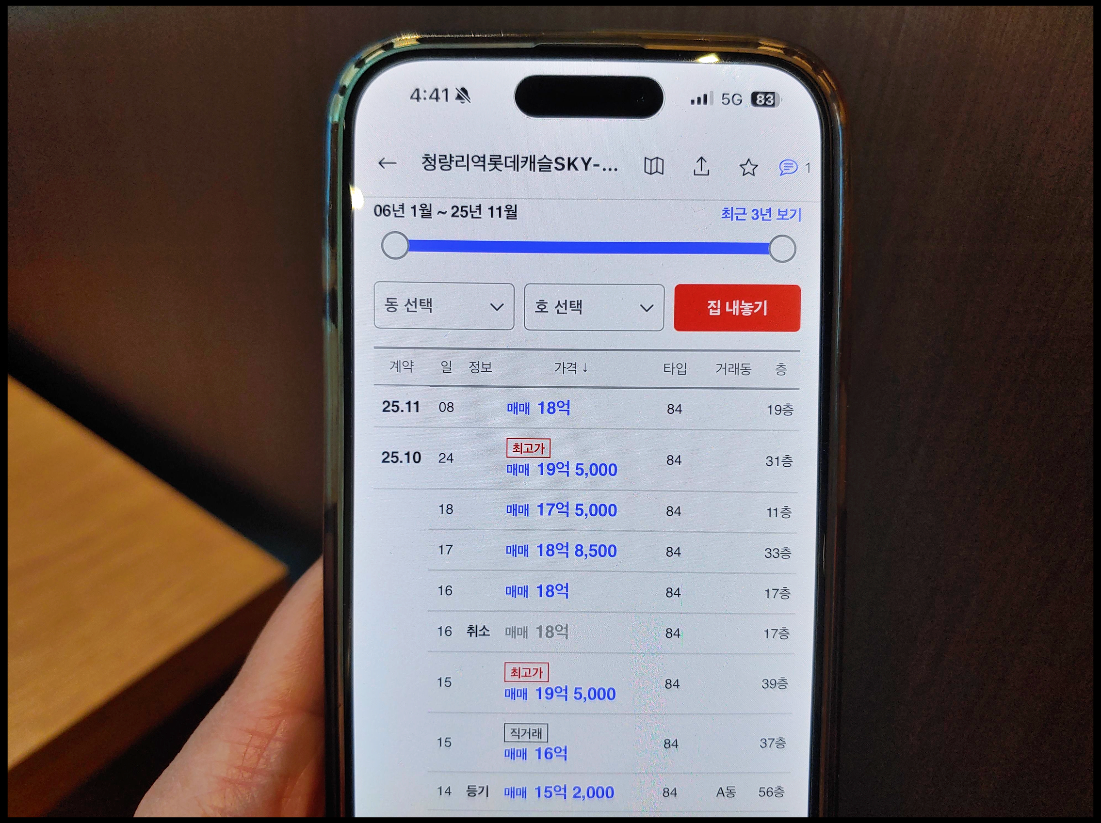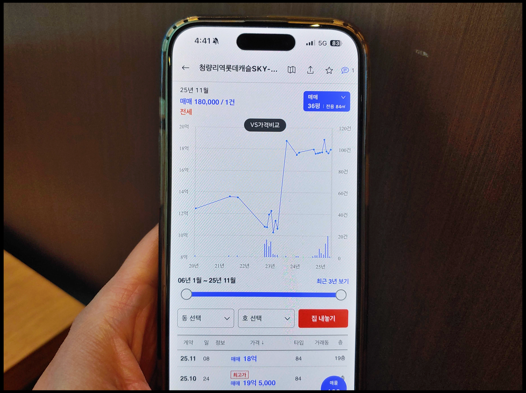 [사진 = 청량리역 롯데캐슬 SKY L65 무순위 나오면서 시세 차익 주목하는 분이 많을 겁니다. 이곳의 최고가 금액은 지난달에 두 번 나왔습니다. 10월 15일과 10월 24일 19.5억 원 최고가 기록이 나왔습니다. 가장 최근인 11월 8일에는 18억 원 거래됐습니다. 모두 84타입에 속합니다. (C) 아파트실거래가 앱]