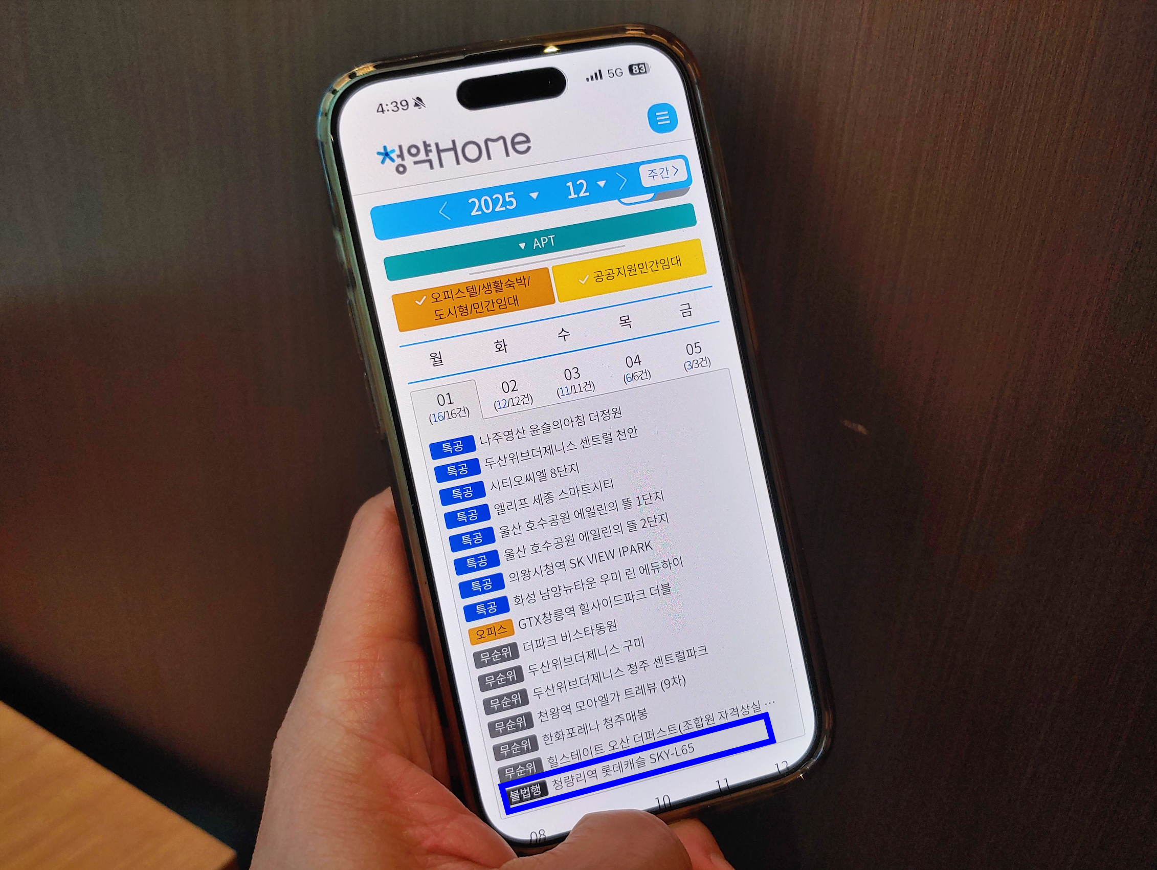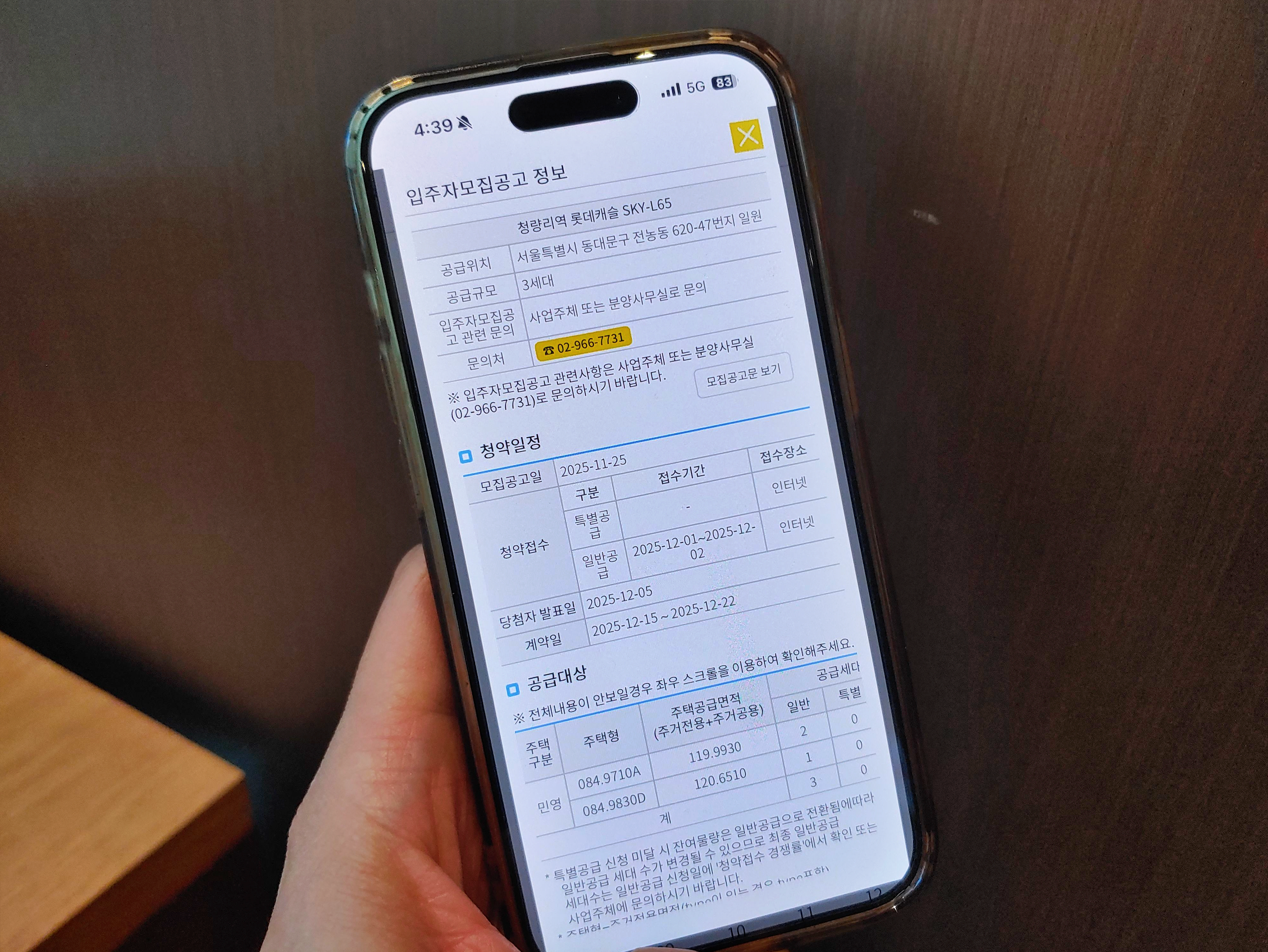 [사진 = 청량리역 롯데캐슬 SKY L65 청약 일정입니다. 오는 12월 1일 월요일부터 2일 화요일까지 이틀 동안 일반공급 접수 예정입니다. 당첨자 발표일 12월 5일 금요일, 서류접수일 12월 8일 월요일부터 9일 화요일까지, 계약체결일 12월 15일 월요일부터 12월 22일 월요일까지이나 주말 제외되므로 총 6일간 진행됩니다. 청약 진행되는 곳은 청약홈이며 오전 9시부터 오후 5시 30분까지 신청할 수 있습니다. (C) 청약홈 앱]