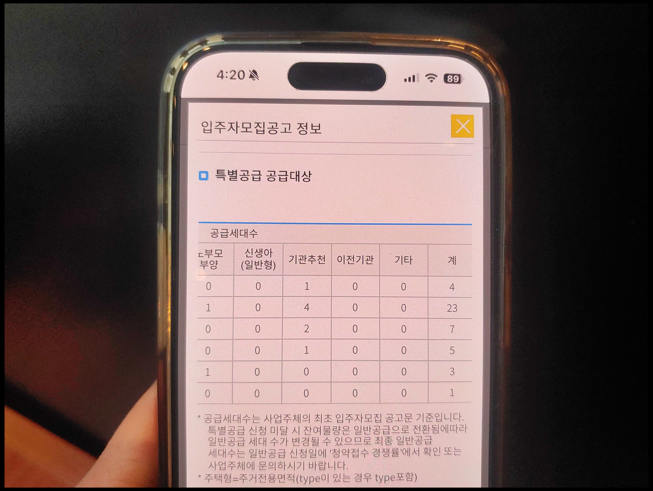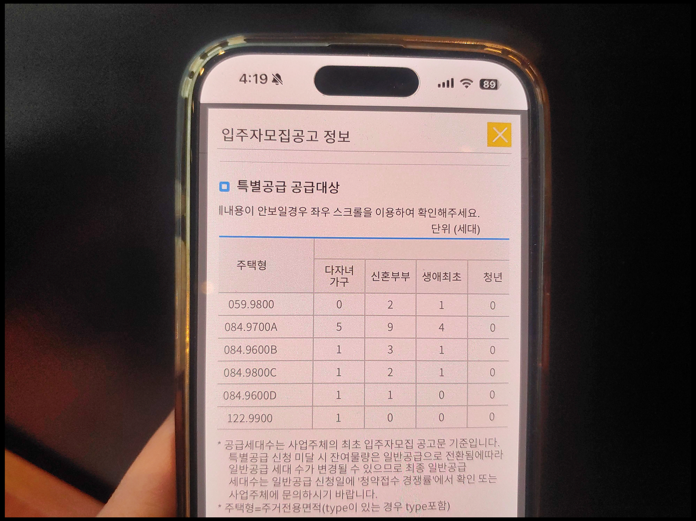 이곳의 일반분양 87세대 중에 일반공급 44세대, 특별공급 43세대 입니다. 특별공급 43대 중에는 신혼부부 17세대, 다자녀가구 9세대, 기관추천 8세대, 생애최초 7세대, 노부모부양 2세대 입니다. / 사진 (C) 청약홈 앱