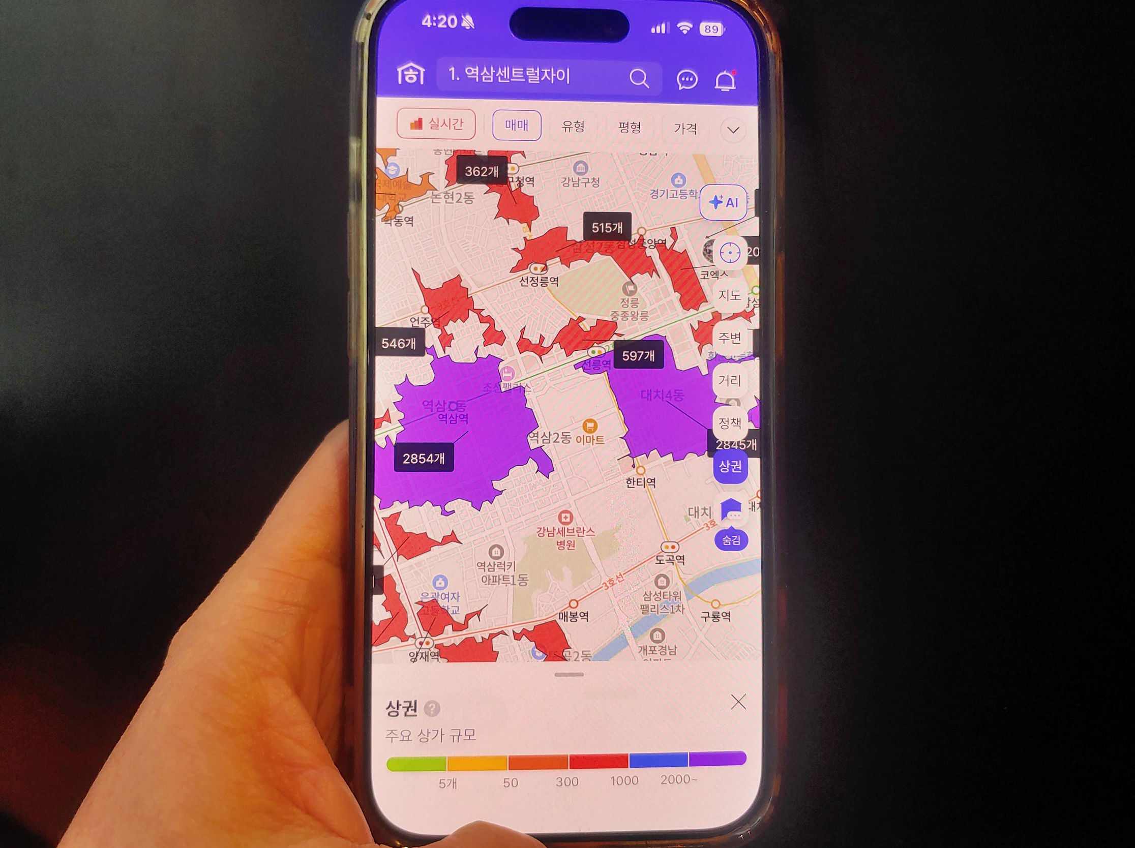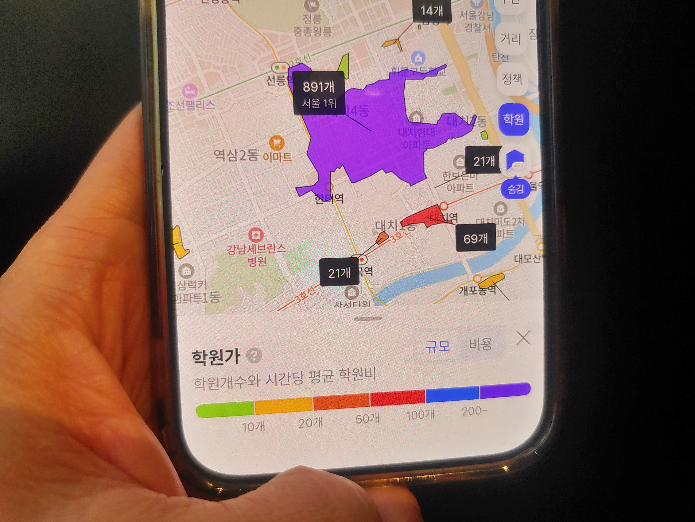 해당 아파트 주위의 상권이 발달된 이점이 있습니다. 오른쪽은 대치동 학원가로서 서울에서 학원이 가장 많이 모여있는 곳이니다. / 사진 (C) 호갱노노 앱