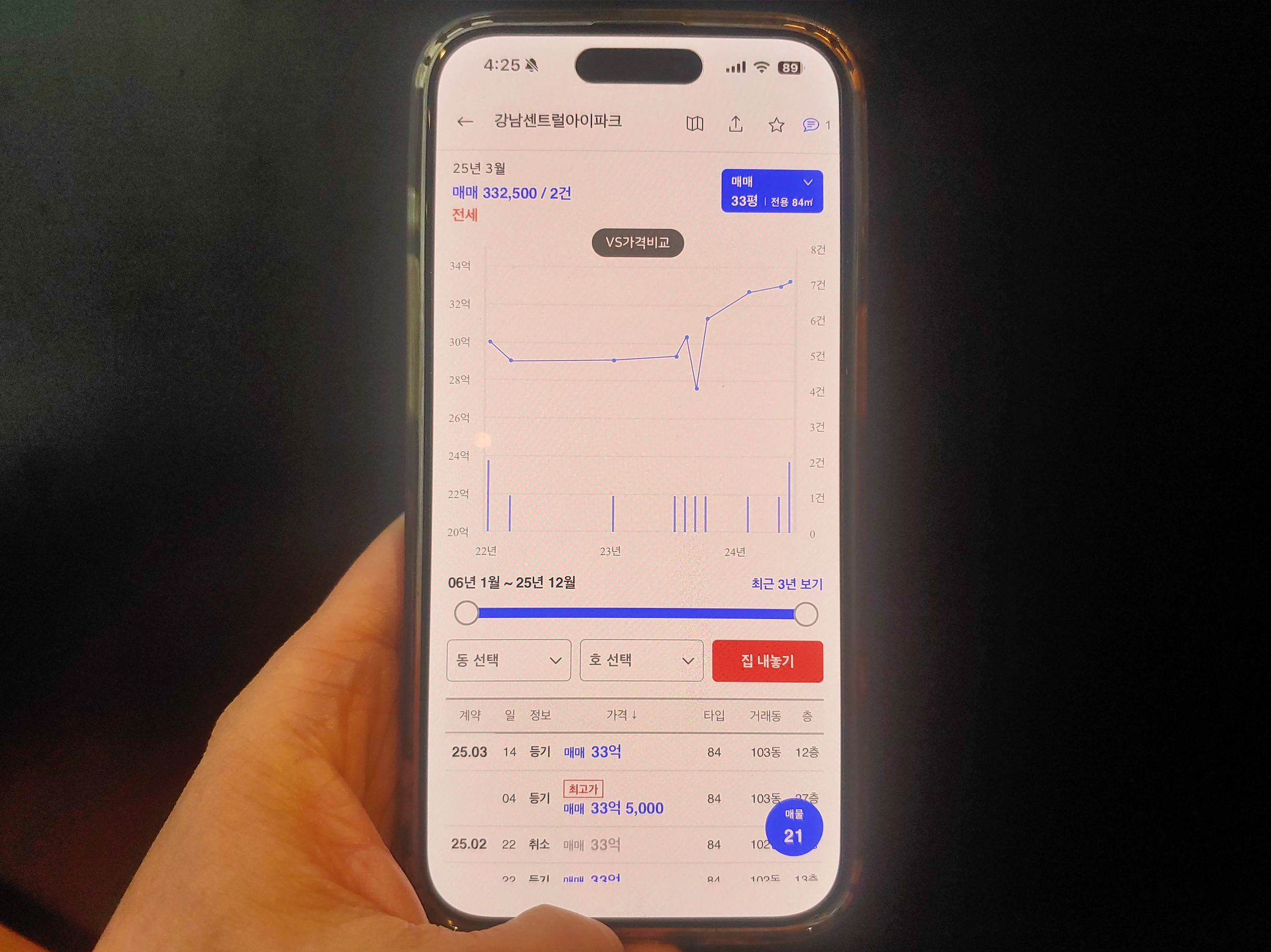역삼센트럴자이 분양가 및 시세 차익 살펴보면 이렇습니다. 인근에 강남센트럴아이파크(2022년 4월 준공, 499세대)가 있습니다. 이곳의 59타입 최근 거래 32억 원(2025년 11월) 84타입 최근 거래 33억 원대(2025년 3월) 발생했습니다. 59타입 시세 차익 10억 원부터 12억 원으로 볼 수 있습니다. 강남센트럴아이파크 59타입 네이버 부동산에 올라온 매물이 최소 31억 원대라는 점에서 시세 차익은 최소 10억 원 됩니다. 84타입 시세 차익 5~6억 원 차이로 보입니다. / 사진 (C) 아파트실거래가 앱