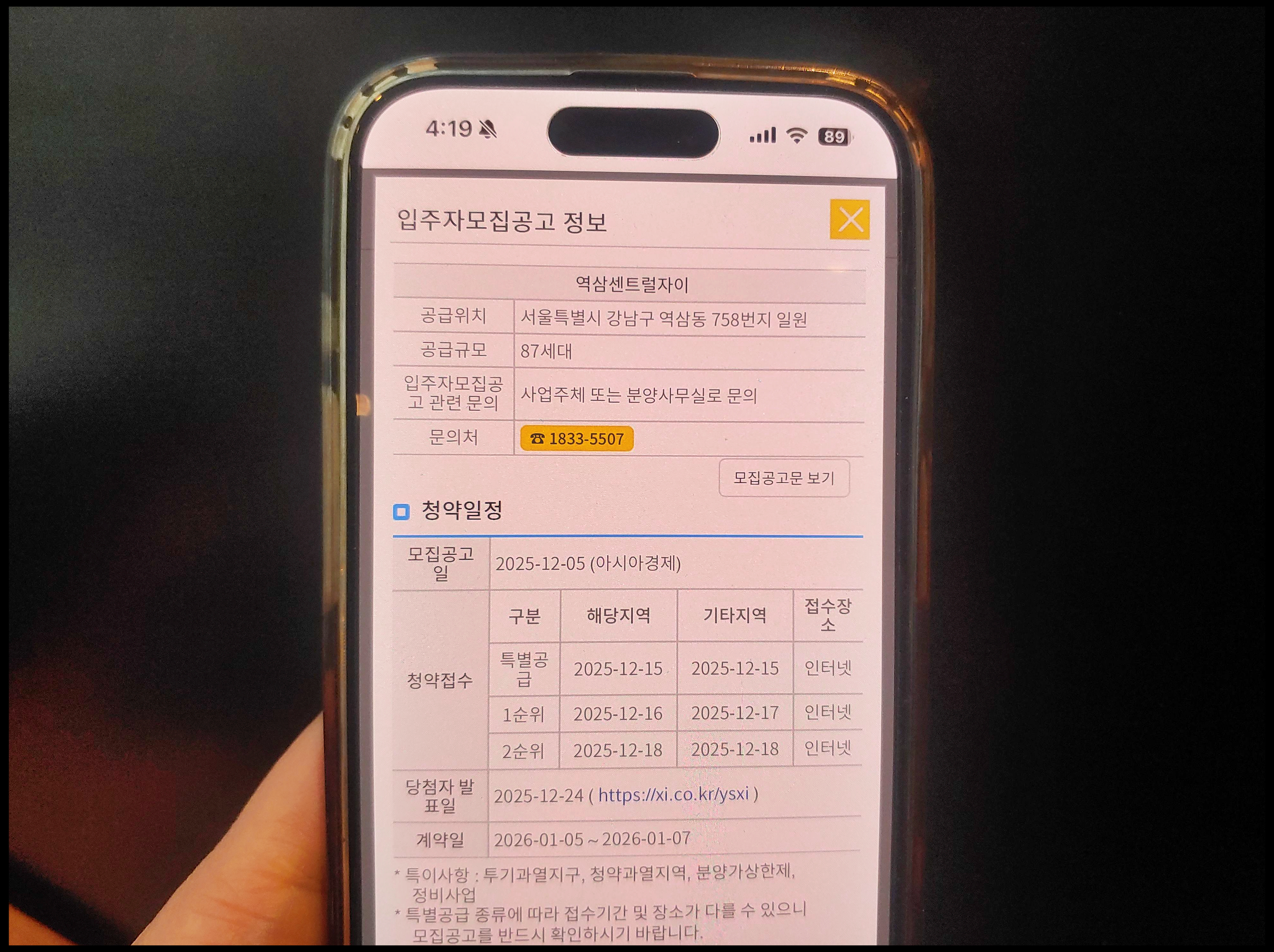 역삼센트럴자이 청약 일정 이렇습니다. 특별공급 접수일 12월 15일 월요일, 일반공급 1순위 접수일 해당지역 12월 16일 화요일, 기타지역 12월 17일 수요일, 2순위 접수일 12월 18일 목요일, 당첨자 발표일 12월 24일 수요일, 서류접수기간 12월 27일 토요일부터 12월 30일 화요일, 계약체결 2026년 1월 5일 월요일부터 1월 7일 수요일까지입니다.