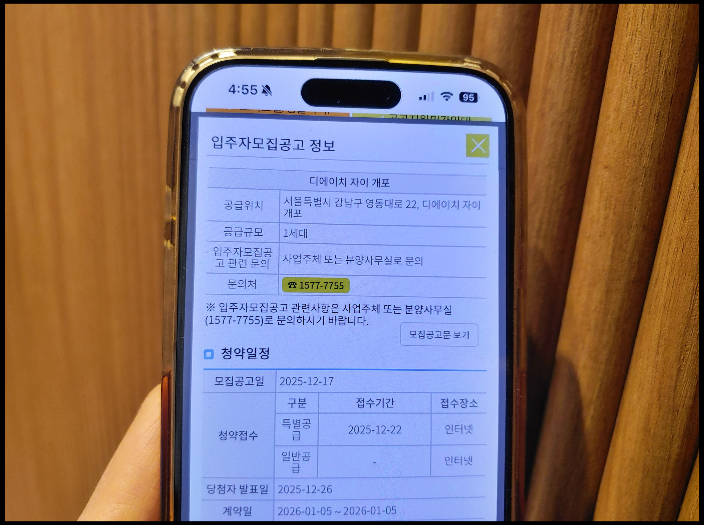 디에이치 자이 개포 줍줍 청약 일정 이렇습니다. 오는 12월 22일 월요일 청약홈 통해서 특별공급 접수하시면 됩니다. 당첨자 발표일 12월 26일 금요일, 계약일 2026년 1월 5일 월요일입니다. 84A 타입 1세대이며, 특별공급 기관추천 장애인 해당되는 분만 청약할 수 있습니다. 분양가 14.75억 원이며 해당 아파트 최근 시세 39억 원에 비해 크게 낮은 편입니다. 만약 당첨된 세대는 오는 2026년 3월 입주 예정입니다. / 사진 (C) 청약홈 앱