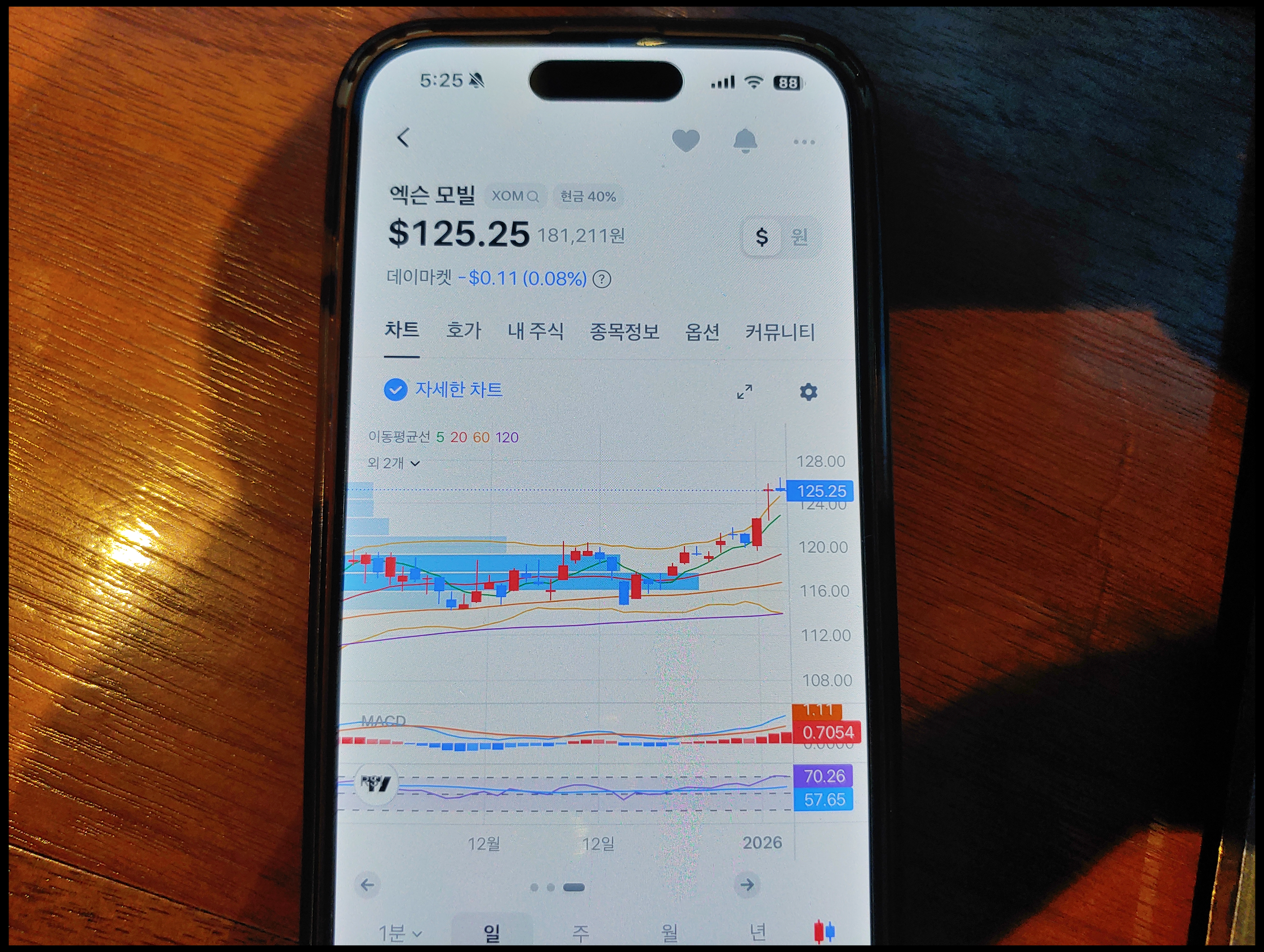 엑슨모빌 주가 1월 5일 2.20% 올랐습니다. 이 종목은 볼린저 밴드 상단 넘었습니다. 국내에서는 미국의 유명 투자자 워런 버핏이 과거에 투자했던 종목으로 회자되는데, 유가 하락 등의 이유로 전량 매각했던 것으로 알려졌습니다. 최근 베네수엘라 이슈로 셰브론 등과 함께 수혜 기업으로 떠오를 수 있을지 주목됩니다. / 사진 (C) 토스 앱