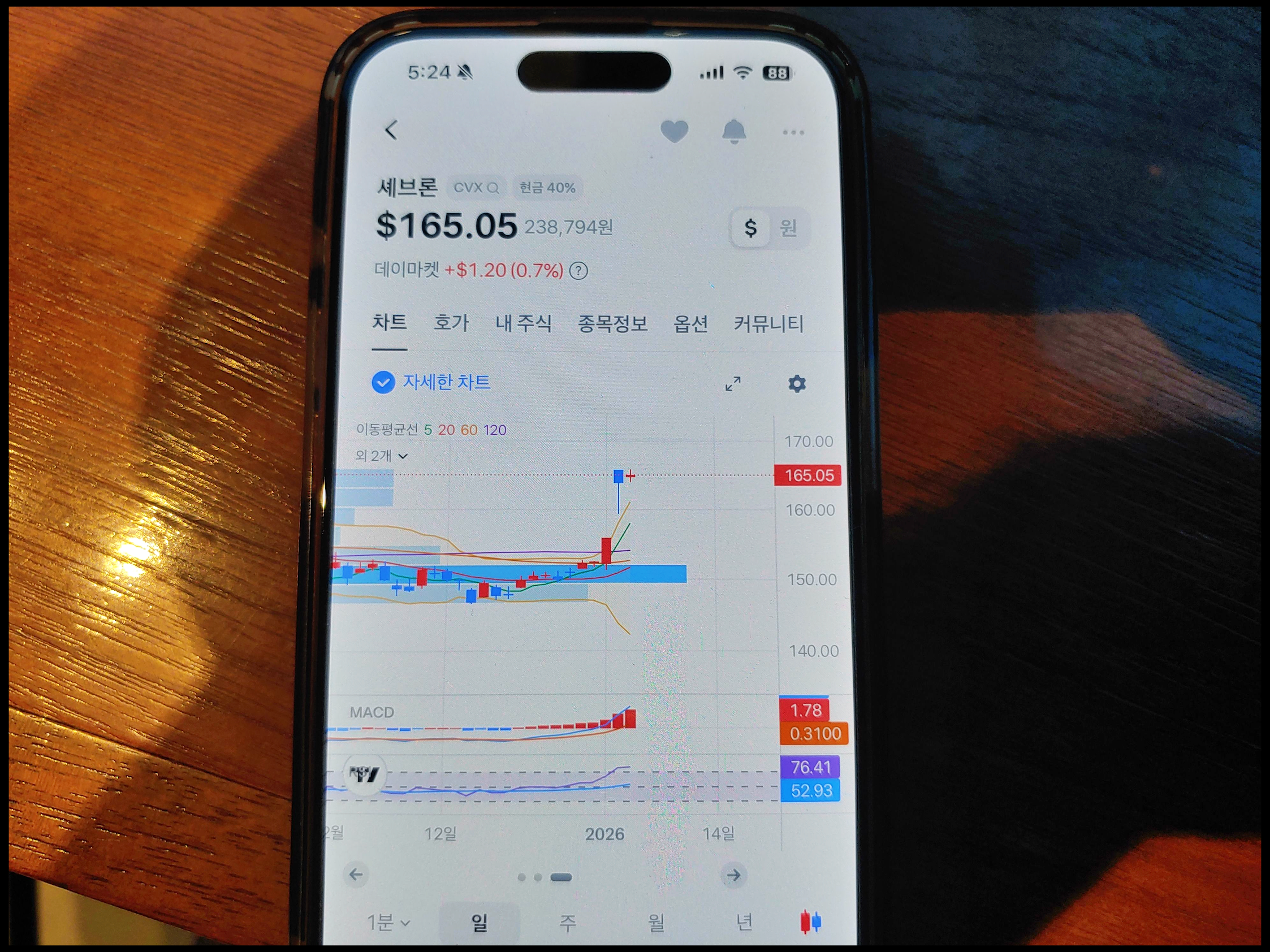 셰브론 주가 1월 5일 5.09% 올랐습니다. 어머아머한 거래량과 함께 볼린저 밴드 상단을 뚫어내는 상승이 나왔습니다. 1월 6일 프리장에서는 양봉이 떴습니다. 베네수엘라 관련 이슈가 셰브론 같은 미국 석유 기업들에 이득임을 알 수 있습니다. 특히 셰브론은 5거래일 연속 상승이 나왔으며(1월 6일 오늘은 프리장 상승중이며, 본장 상승 시 6거래일 연속 상승), 베네수엘라 이슈 전날에는 장대양봉이 나왔습니다. 여기서 장대양봉이 뜬 것은 무언가의 이유가 있었음을 말하는데, 어쩌면 현지 기관이 이번 상황을 예견한 것이 아닌가 싶은 생각이 듭니다. / 사진 (C) 토스 앱