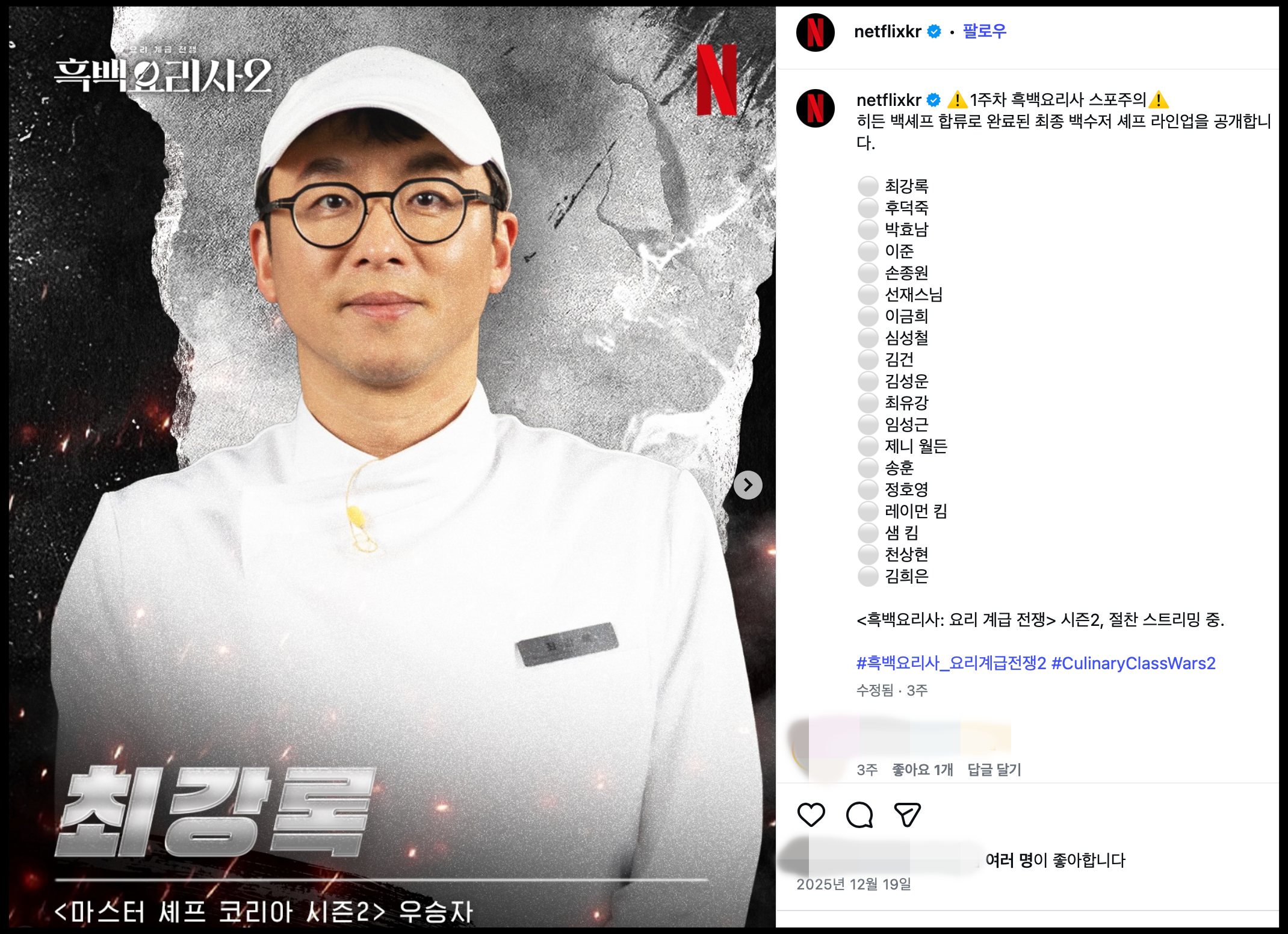 이 포스팅은 1월 9일 금요일에 작성되었습니다. 흑백요리사2 12화 까지 방영된 시점입니다. 최 셰프가 결승 진출 확정지은 모습을 11화에서 볼 수 있었습니다.