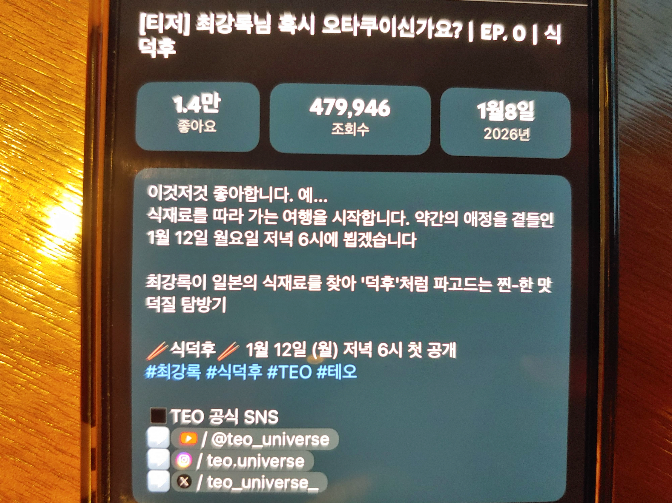 최강록 셰프가 김태호PD 제작사 웹 예능에 등장합니다. 일본 현지 식재료 여행 콘텐츠 '식덕후' 출연할 예정입니다. 티저 영상 유튜브에 오픈된지 하루 만에 조회 수 47만 뷰 기록할 정도로 누리꾼들의 엄청난 관심을 받게 됐습니다. 오는 1월 12일 월요일 오후 6시 첫 영상이 오픈될 예정입니다. / 사진 (C) TEO 테오 유튜브 채널