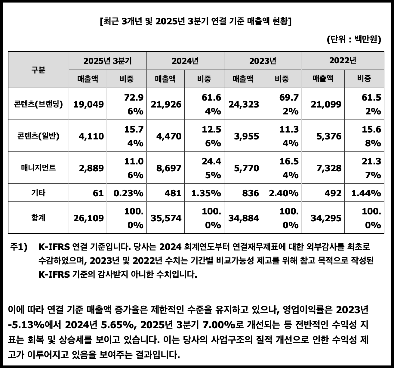 이번 에스팀 공모주 청약 기관 반응 양호하게 나온 이유중에 하나는 흑자 기업인 영향도 있을 겁니다. 2024년부터 흑자 기업으로 전환했습니다. 또한 매출액 2024년 307억 원 및 2025년 3분기 누적 241.5억 원 나왔습니다. 이는 2022년 204.9억 원, 2023년 177.3억 원을 넘어서는 규모입니다. 여기에 영업이익 및 당기순이익 2024년부터 흑자로 전환하면서 재무 상황이 더 좋아졌습니다. 대중들에게는 흔히 모델 매니지먼트 회사로 인식되나 2025년 3분기 매출액 규모에서는 콘텐츠 비중이 매니지먼트보다 압도적으로 더 높습니다. 브랜딩 콘텐츠 72.96%, 일반 콘텐츠 15.74%, 매니지먼트 11.06% 차지합니다. 콘텐츠 기업이 맞습니다.