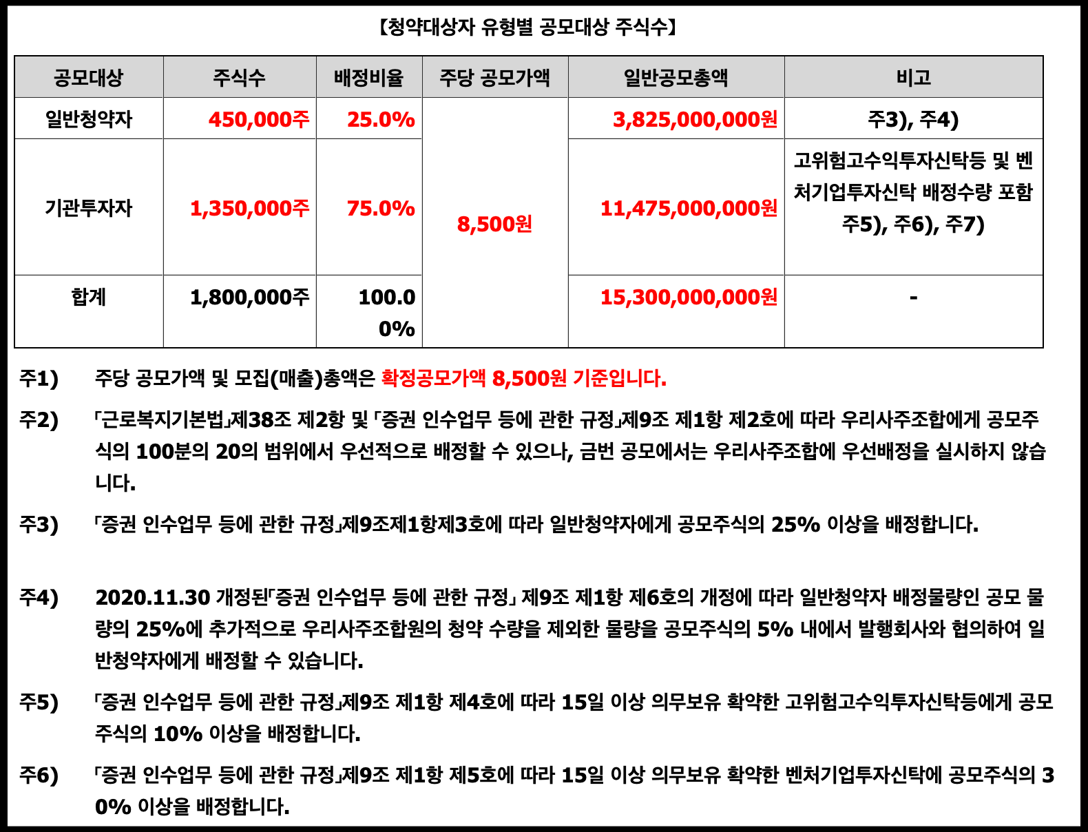 공모금액 : 공모주식(1,800,000주) x 공모가(8,500원) = 153억 원