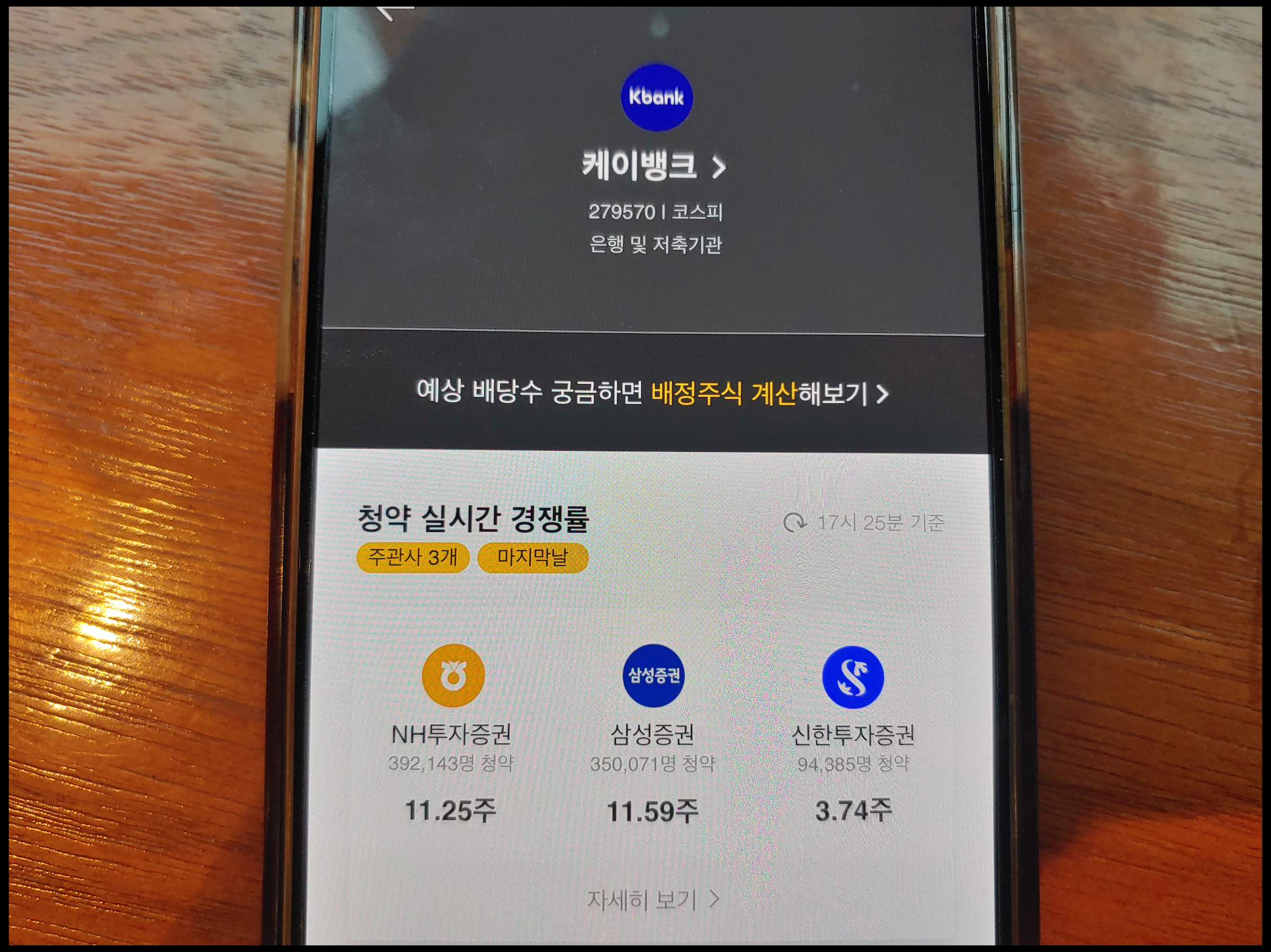2월 22일과 23일 청약 진행된 케이뱅크 공모주 청약건수 3개 증권사 총 836,588건입니다. NH투자증권 392,143건, 삼성증권 350,060건, 신한투자증권 705,600주 입니다. 특히 NH와 삼성의 1인당 균등 배정 각각 11.25주 및 11.59주로서 많은 편입니다. 83만 건 청약이 들어왔다는 것은 공모주 향한 사람들의 관심이 높음을 의미합니다. 이 열기가 3월에도 이어질지 여부가 주목됩니다. 만약 기관 수요예측 결과 잘 나오고, 코스닥 시장 상황까지 좋으면 50만 건 이상 기록하는 종목이 나타날 가능성 있습니다. / 사진 (C) 나무증권 앱