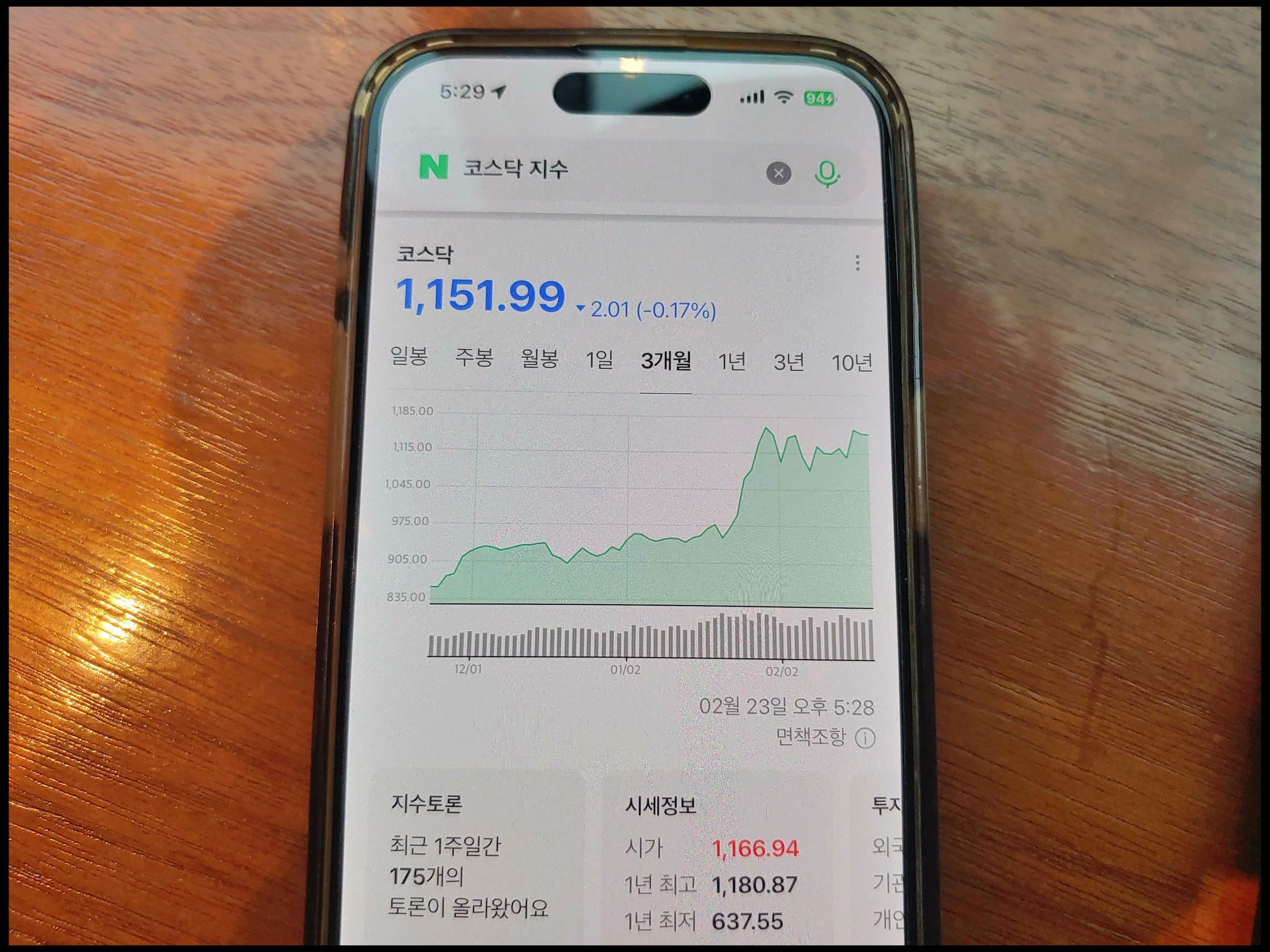 코스닥 지수 2월 23일 현재 상황입니다. 전거래일보다 0.17% 빠진 1,151.99 기록했으나 여전히 1,150선 지키는 중입니다. 지난 3개월 동안의 추이를 살펴보면 1월 중순에 크게 올랐음을 알 수 있습니다. 이미 코스피 지수 5,000선 돌파하면서 코스닥으로 수급 이동하는 순환매가 이루어졌는데, 2월 23일 코스피 지수 장중 5,900선 돌파했습니다.(종가 5,846.09) 코스피에 쏠렸던 수급이 또 다시 코스닥으로 순환매 이루어질지 여부가 주목됩니다. / 사진 (C) 네이버 앱