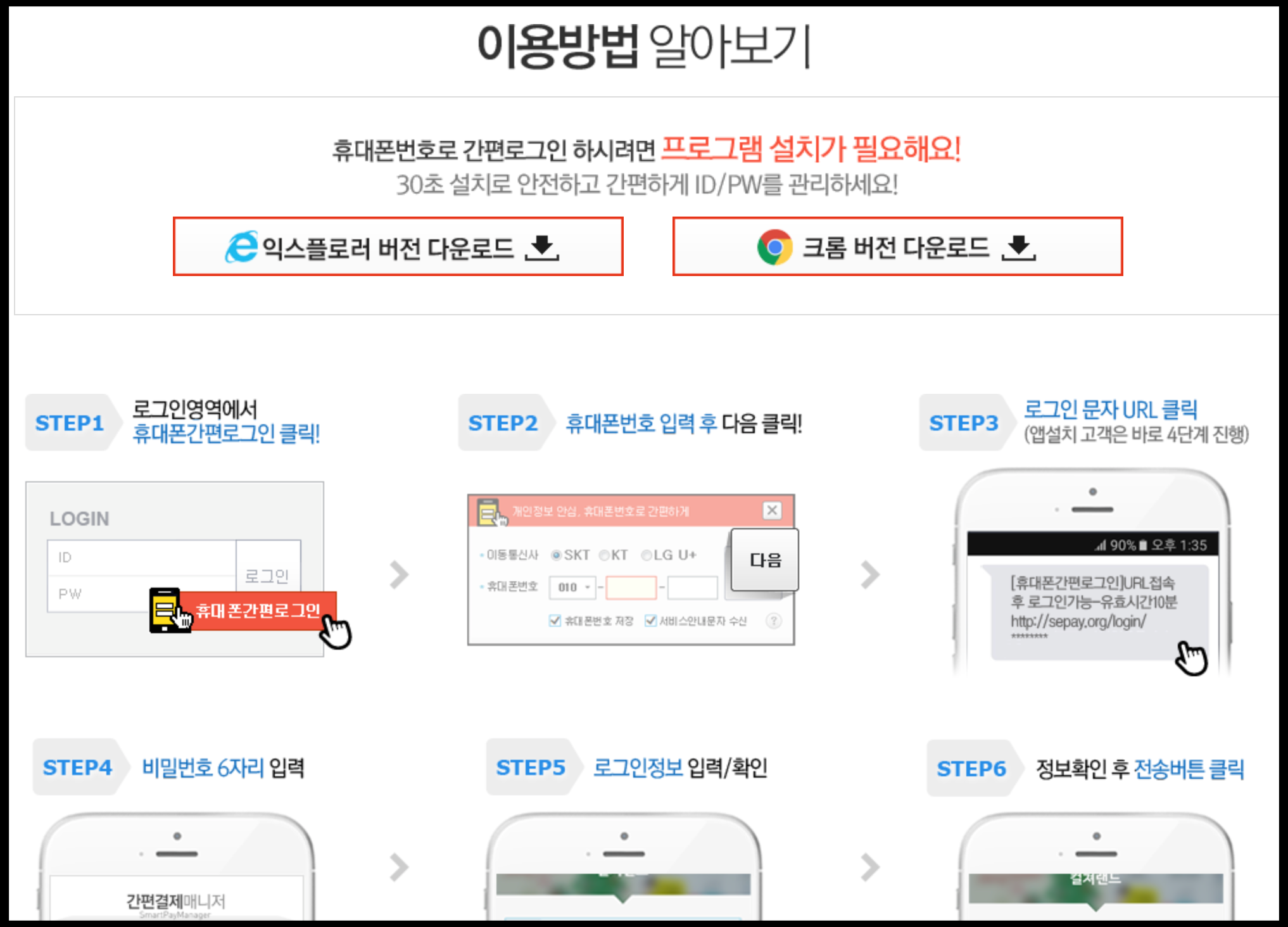 간편결제매니저를 PC에서 이용하려면 프로그램 설치가 필요합니다. 해당 홈페이지 상단에 있는 '서비스 안내>서비스 이용방법' 순서로 접속하면 익스플로러 버전, 크롬 버전 다운로드 받는 항목이 있습니다.