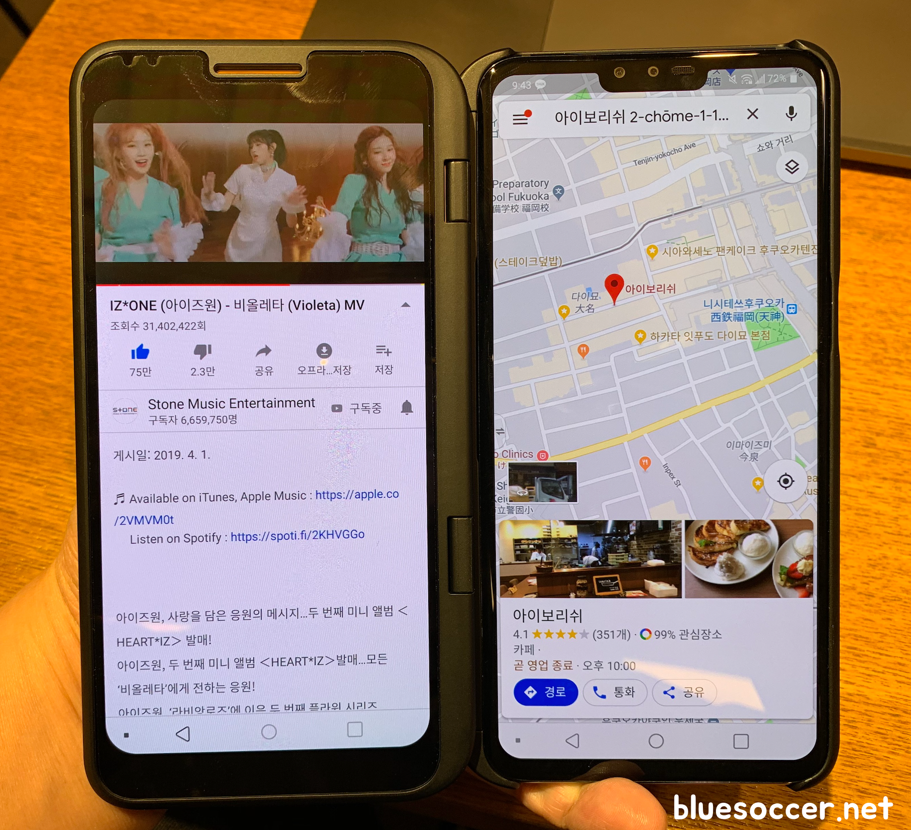 이번에는 듀얼 앱 모드를 활용하겠습니다. 스크린 왼쪽은 아이즈원 비올레타 뮤직비디오, 오른쪽은 구글 맵스 화면입니다.