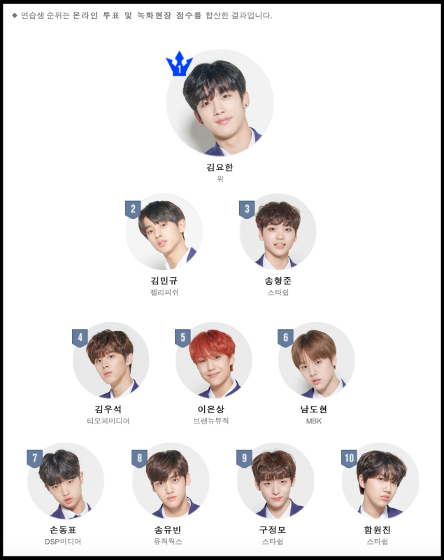 [사진 = Mnet 프로듀스 X 101 5주차(1차 순위 발표식) 데뷔권 10위 이내의 순위 이렇습니다. 송형준 3위 올랐으며 투표 수는 1,024,849표입니다. 1위 김요한 (1,094,299표)과의 표 차이는 69,450표입니다. 반면 4위 김우석 (933,869표)과의 표 차이는 90,980표로서 격차가 어느 정도 존재합니다. 이는 프로듀스 X 101 송형준 강력한 1위 후보였음을 알 수 있습니다. 지금까지 송형준 순위 변화는 9-10-4-3위로서 인기가 점점 높아지는 중입니다. 현재 송형준 3위임을 놓고 보면 프로듀스 X 101 데뷔권에 속하는 연습생 중에 인기 향상이 뚜렷한 대표적 인물로 꼽을 수 있습니다. (C) Mnet 프로듀스 X 101 공식 홈페이지]