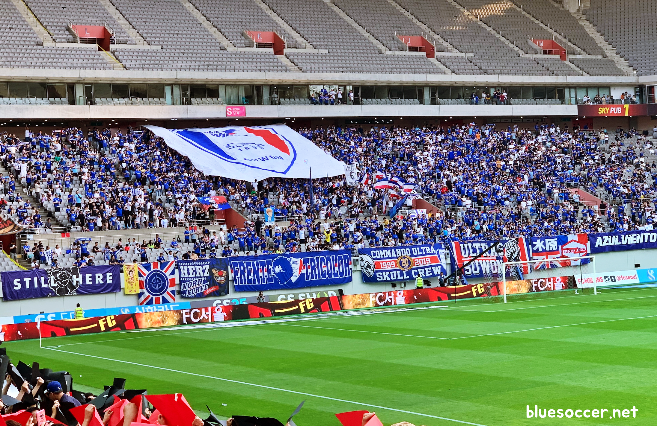 이번 경기가 K리그의 인기 팀들이 맞붙기 때문인지 양팀 서포터즈의 응원 열기가 엄청났습니다. 홈팀 FC서울 서포터즈가 E석 관중들과 함께 카드섹션을 펼치는 응원 열기를 보여줬다면 원정팀 수원 블루윙즈 서포터즈는 많은 사람들이 파란색 옷을 입으며 원정 관람석에 운집했습니다.