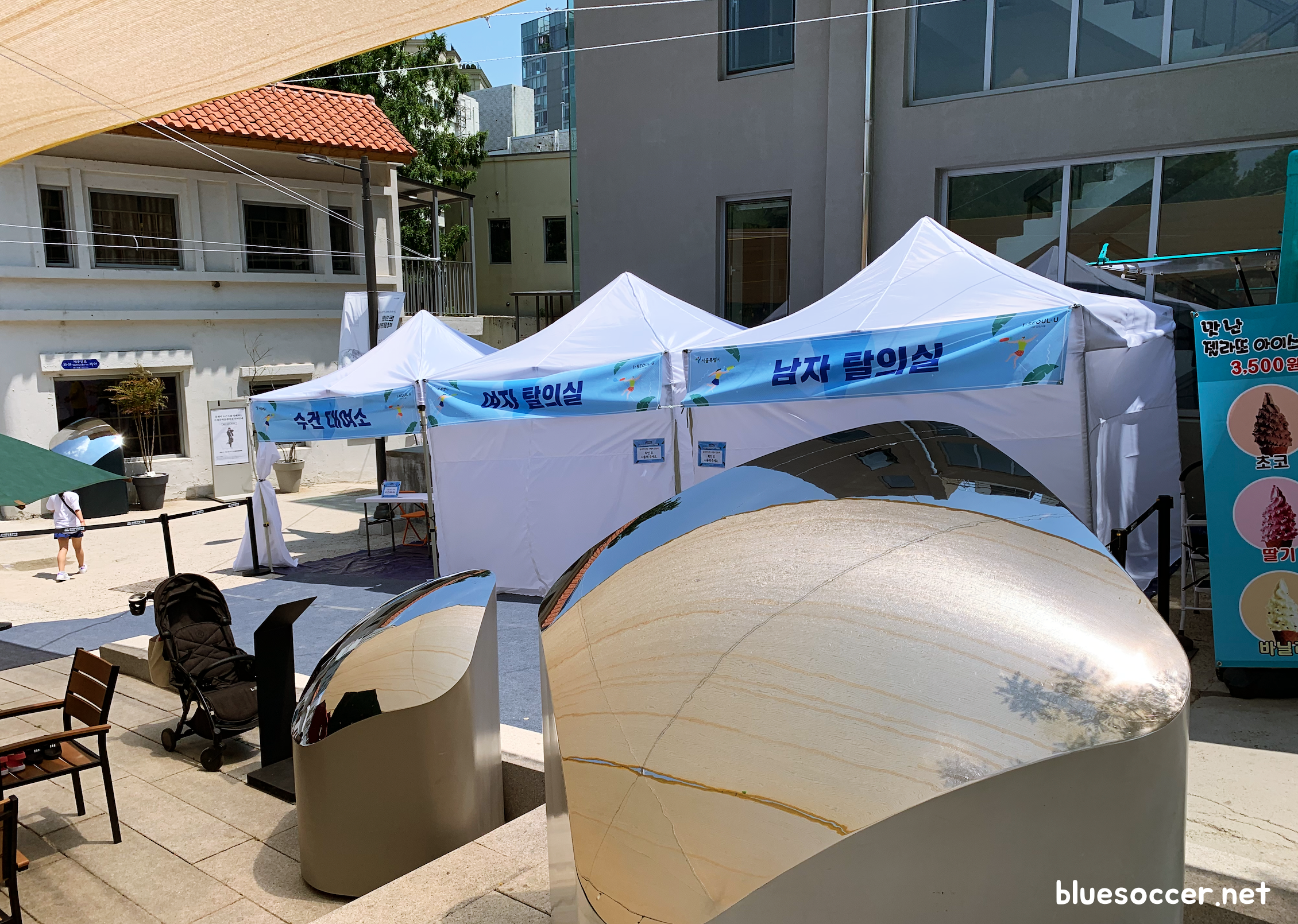 풀장 옆에는 수건 대여소, 여자 탈의실, 남자 탈의실이 있습니다. 풀장에 들어갈 어린이 자녀가 옷 갈아입을 공간이 있습니다.