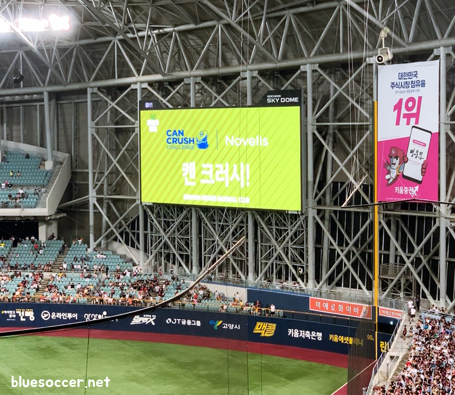 경기 중에는 캔크러시챌린지를 알리는 광고가 전광판에서 여러 차례 상영됐습니다. 광고 재생 시간이 상당히 짧았음에도 사람의 발로 캔을 밟으면서 캔크러시챌린지 참여해달라는 메시지가 임팩트있게 느껴졌습니다.