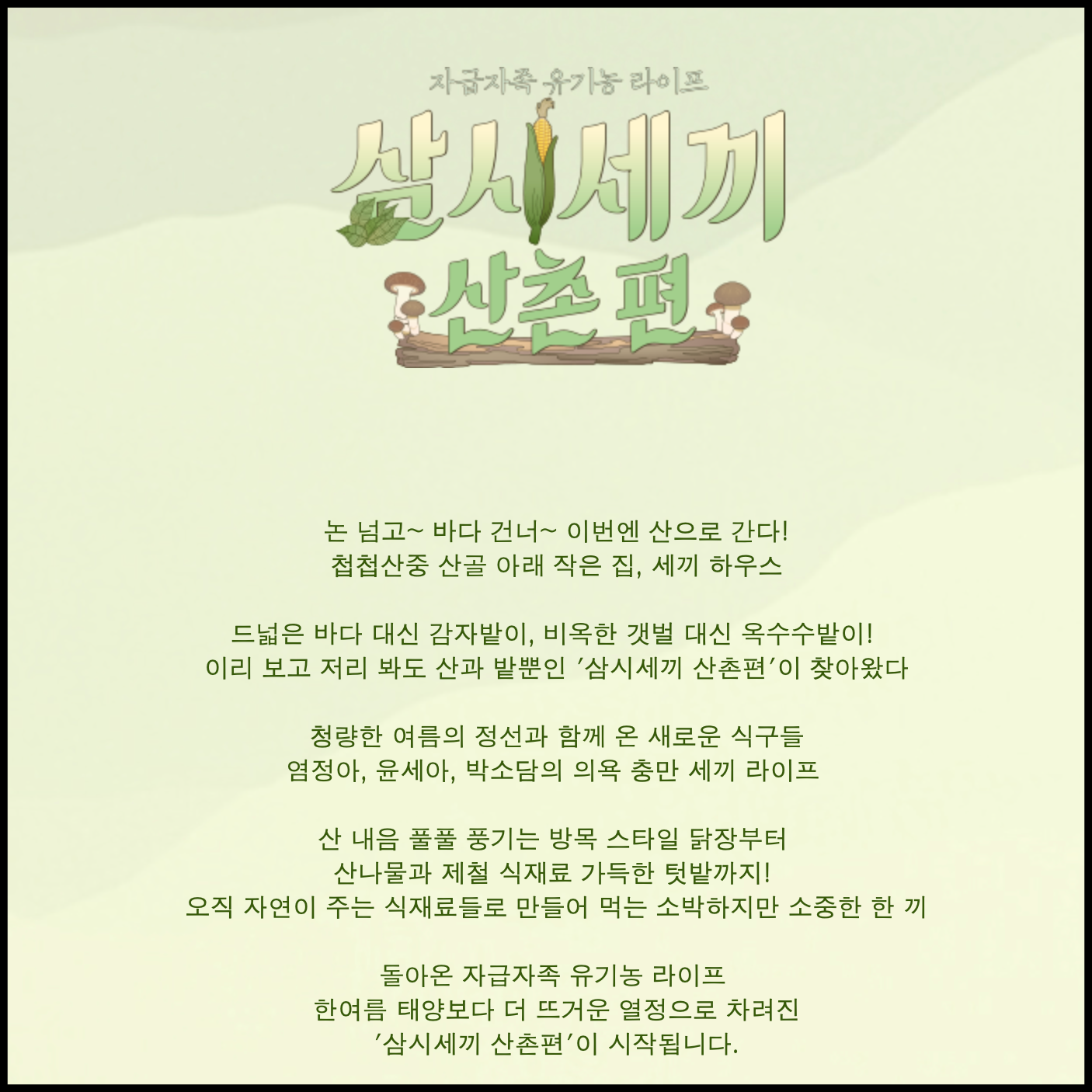 [사진 = tvN 삼시세끼 산촌편 공식 홈페이지에 언급된 프로그램 소개. 삼시세끼는 8번째 시즌을 맞이했으나 산촌을 테마로 하는 콘셉트는 이번 시즌이 처음입니다. 이전에 정선편이 방영된 적이 있으나 2019년 삼시세끼는 촬영 장소가 다릅니다. 정선의 산촌마을을 배경으로 촬영합니다. 삼시세끼 방영 초반에는 촬영지가 주목을 끄는 경향이 강했는데, 일본 여행 수요 대폭 감소로 국내 여행 수요가 증가할 것으로 예상되는 시점에서 삼시세끼 정선편 흥행 성공 시 산촌 여행 인프라가 높을 것이라는 기대감이 느껴집니다. (C) tvN 삼시세끼 산촌편 공식 홈페이지]