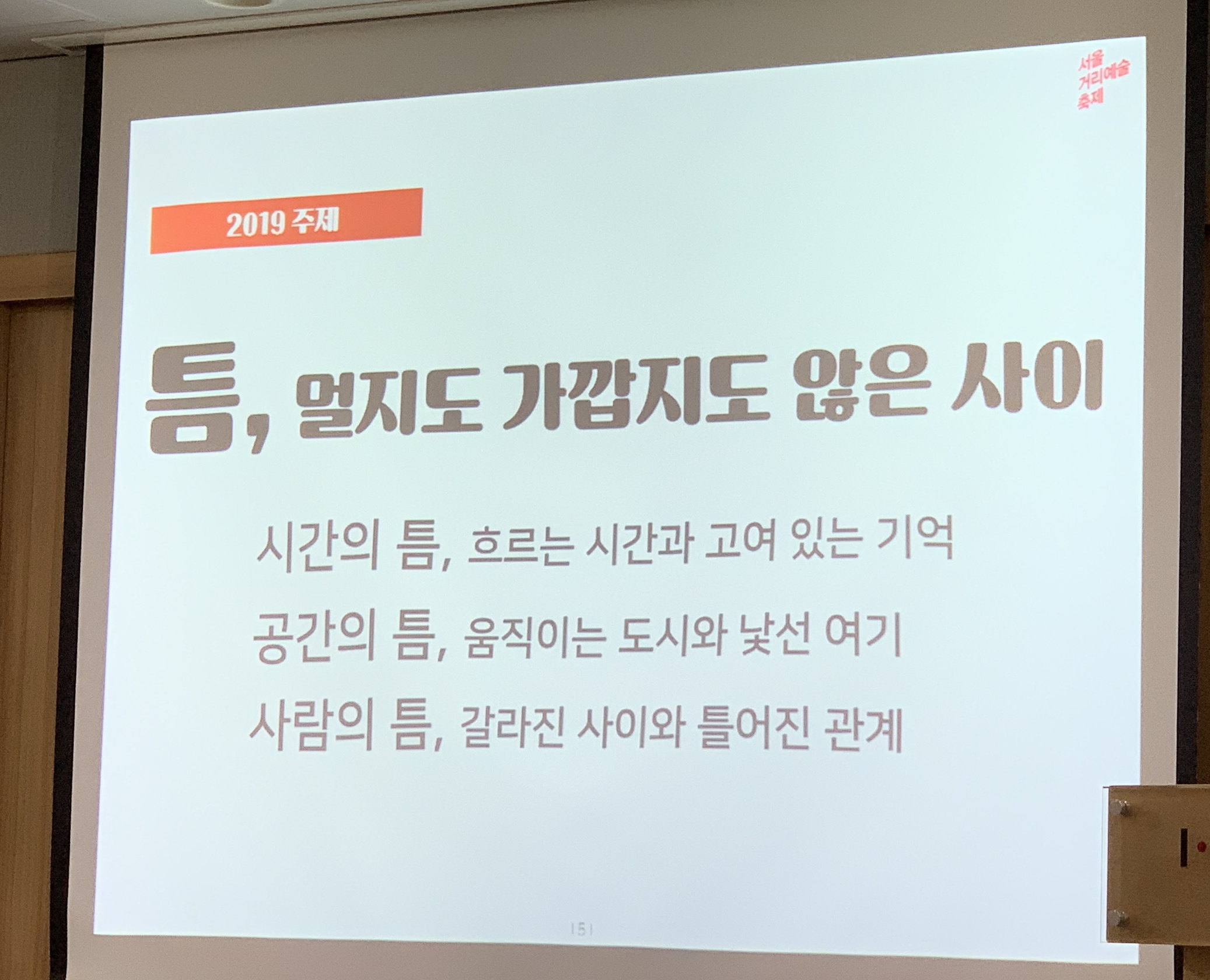 서울거리예술축제 2019 행사의 주제는 '틈, 밀지도 가깝지도 않은 사이' 입니다. 틈이라는 단어의 어감을 떠올리면 이 행사와 잘 어울리는 것 같습니다. 틈은 무언가 비어있는 것을 채워가는 느낌을 떠올리기 쉽습니다. 거리예술 공연 또한 마찬가지 인 것 같습니다. 거리에서 누군가가 공연을 하면 그 분위기가 아름답거나, 멋지거나, 유쾌하거나, 흥이 넘칠 것입니다. 서울거리예술축제 2019는 아마도 서울 도심의 거리를 지나다니는 사람들 중에 거리예술 공연하는 모습을 보는 사람이 꽤 있을 것으로 짐작됩니다. 우연히 공연하는 모습을 보며 그 콘텐츠가 전하는 분위기를 느끼게 될 것으로 보입니다. 언뜻보면 거리예술 공연이 낯설게 느껴지기 쉬운 먼 존재로 인식될 수도 있으나 직접 그 공연을 보니 '가까운 존재'라는 것을 이번 축제를 통해 시민들에게 알리는 것 같습니다.