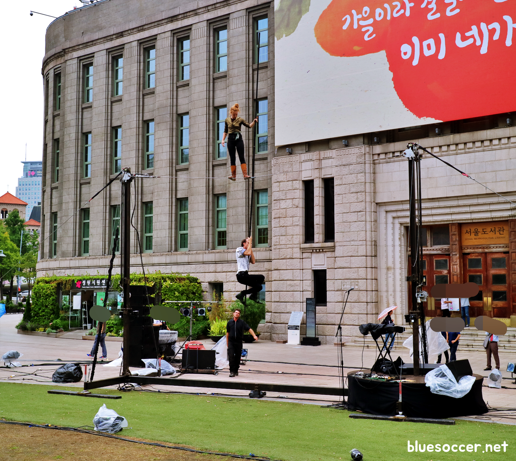 그 이후에는 '저항'(레 피 뒤 레나드 팔, 프랑스)이라는 퍼포먼스가 펼쳐졌습니다. 한국에서만 줄 타기가 있는 줄 알았는데 유럽에서도 줄 타기를 한다는 것을 처음 알았습니다. 한국 민속 줄 타기와 차원이 다른 서양의 줄 타기를 서울거리예술축제 2019에서 볼 수 있습니다.